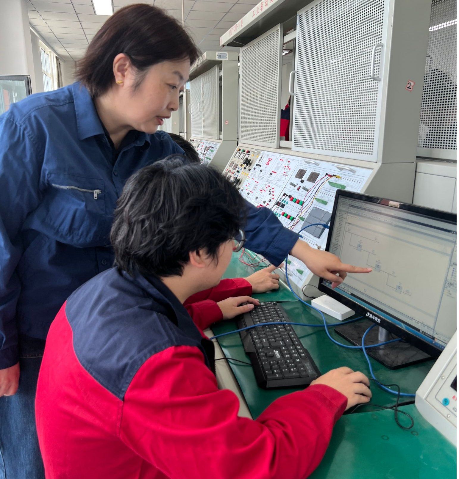 在课堂上,杜蕊老师注重培养学生的职业素养和道德品质。她将德育贯穿于教学的全过程,通过案例分析、小组讨论等方式,引导学生树立正确的价值观和职业观,以安全教育为切入口培养学生工匠精神。她要求学生在课堂上遵守纪律、尊重他人、积极参与、精益求精,培养学生的团队合作精神和责任感。她还注重培养学生的创新意识和实践能力,鼓励学生勇于尝试、敢于创新,在实践中不断探索和进步。李小龙是班干部,中专参加过自动化类的技能大赛,他对自己的技能很有信心,在一次电机与电气控制实训课上却没有实现控制要求,看着别的小组纷纷通过验收,急得他满头大汗,也找不到原因,杜老师在验收的间隙发现这一情况,把他叫过去问了两个问题:“两个接触器主触点接通后电机通电相序分别是什么?如果电机通电相序没有改变应该怎么改?”用这种方式还原解决问题的过程,鼓励他们组自主思考排除故障,通过验收时他们脸上绽放的不仅是胜利的笑容更是自信的笑容。