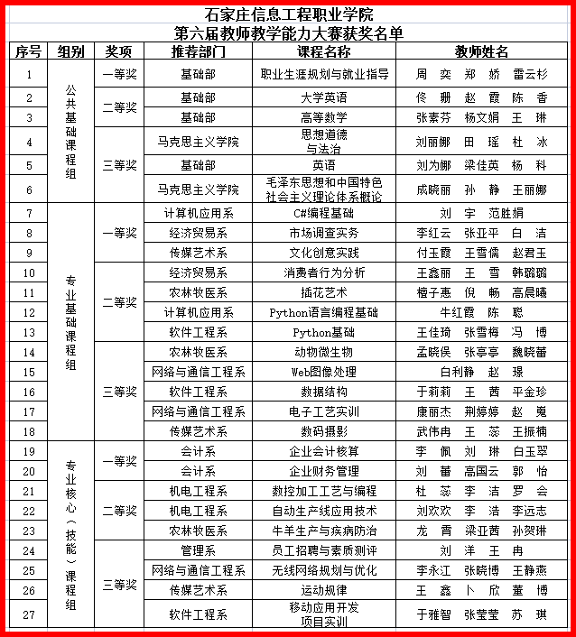 大赛评审委员会全体委员围绕教学设计思路、教学内容重构、教学实施过程、教学组织策略、课程思政融入、教学效果评价等方面与参赛教师进行了详细而深入的交流,提出了进一步改进和提升的意见与建议。经客观、公正评审,大赛评选出公共基础课程组一等奖1个、二等奖2个、三等奖3个;专业基础课程组一等奖3个、二等奖4个、三等奖5个;专业核心(技能)课程一等奖2个、二等奖3个、三等奖4个。