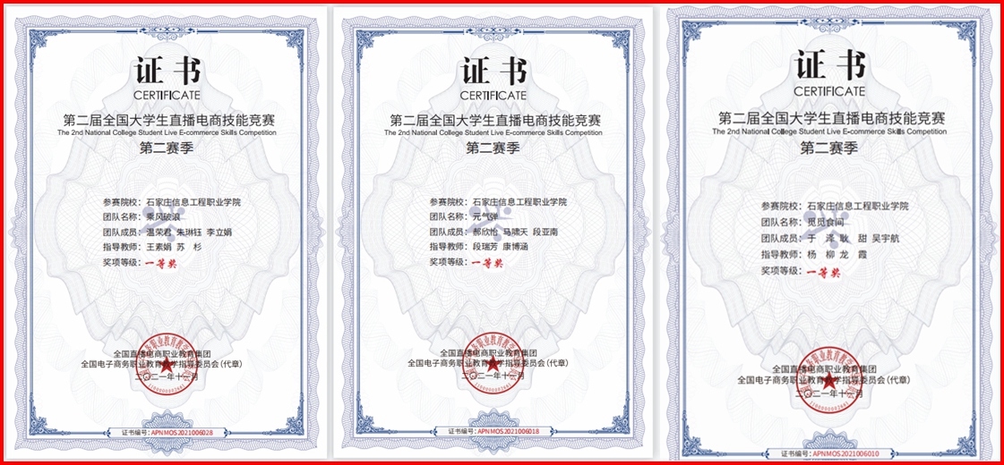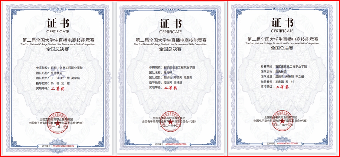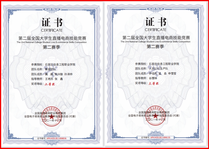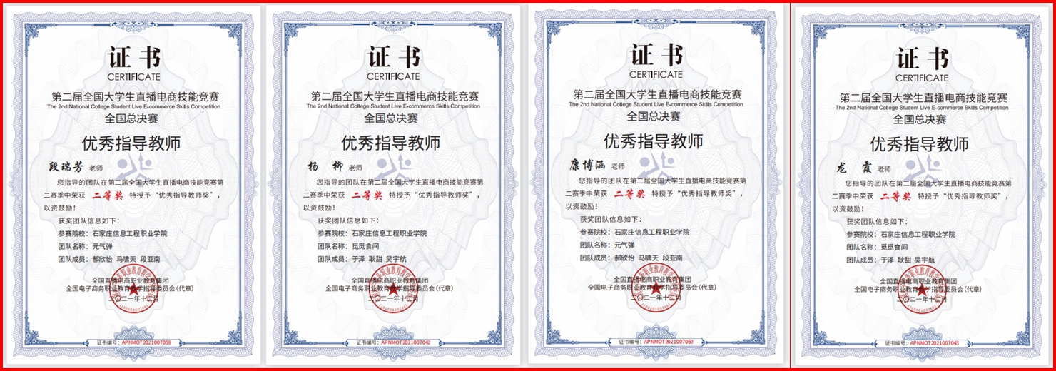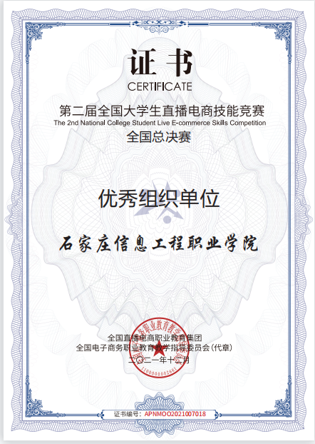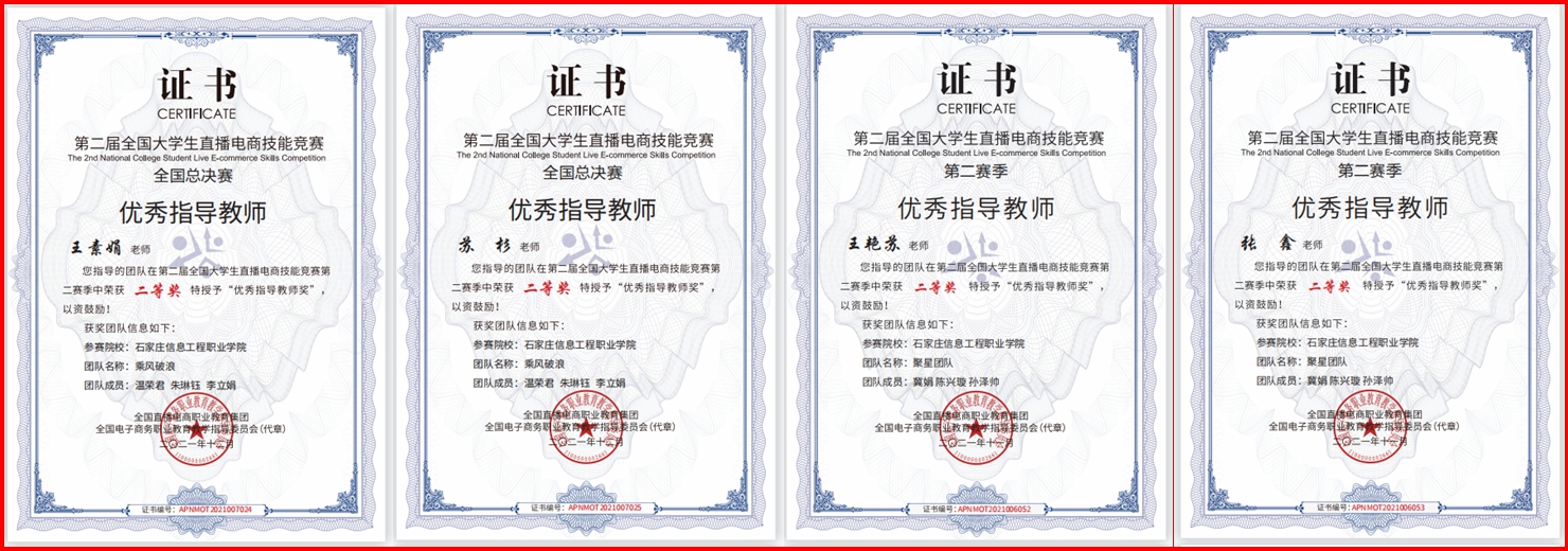 在第二届全国大学生直播电商技能竞赛(简称“直播竞赛”)全国总决赛暨第六届“奥派杯”全国移动商务技能竞赛全国总决赛中,世界杯官网经济贸易系派出的三支代表队均获得全国总决赛二等奖,世界杯官网荣获“优秀组织奖”,王艳苏、王素娟、张鑫、苏杉、杨柳、龙霞、康博涵、段瑞芳8名教师均获得“优秀指导教师”称号。