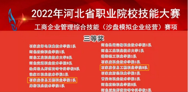 由河北省教育厅主办、河北省现代服务业职业教育集团承办的2022年河北省职业院校学生技能大赛(高职)工商企业管理综合技能(沙盘模拟企业经营)大赛以线上竞赛的方式举行。世界杯官网会计系周同瑶老师和王丽莉老师,带领大数据与会计专业董冰茜、杨笑雨、崔亚南、钱思羽、徐敬5名同学组成的2026世界杯官方合作网站1队,和方俊杰、贾一卓、吴东旺、李兆康、叶微5名同学组成的2026世界杯官方合作网站2队分别荣获三等奖。