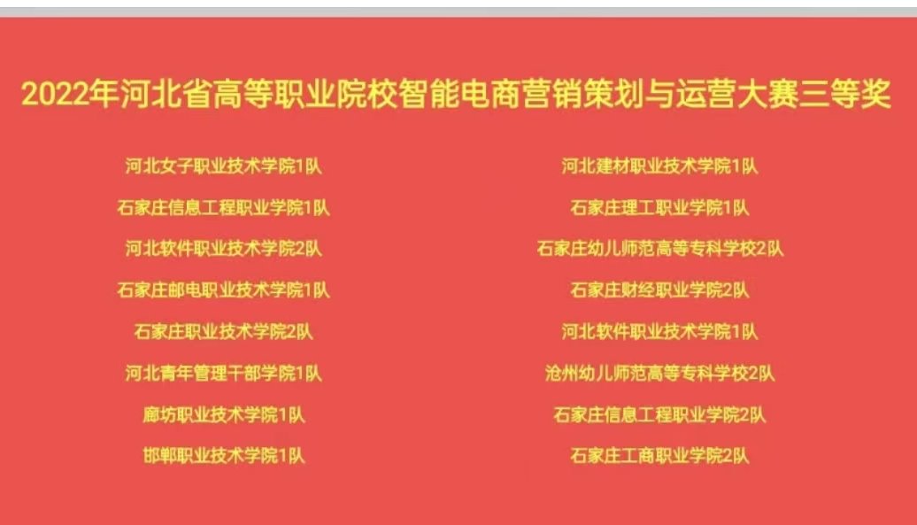 5月22日,2022年河北省高等职业院校智能电商营销策划与运营大赛圆满落幕。经济贸易系学生组成的2支参赛团队双双荣获团体三等奖。