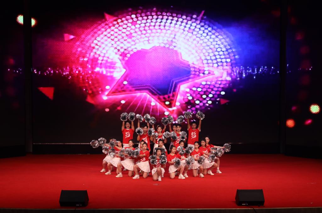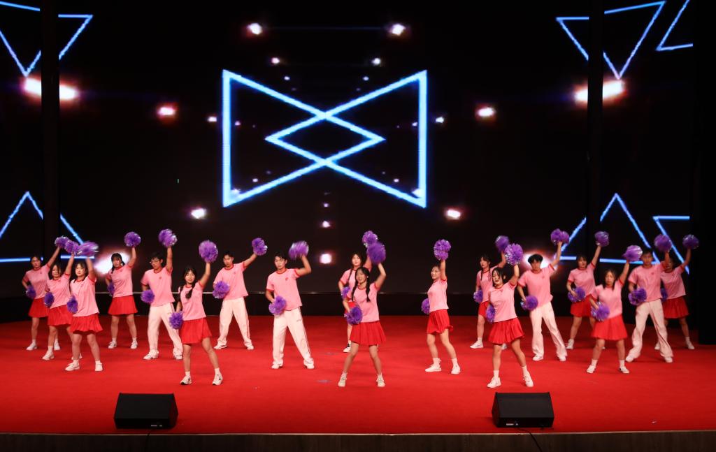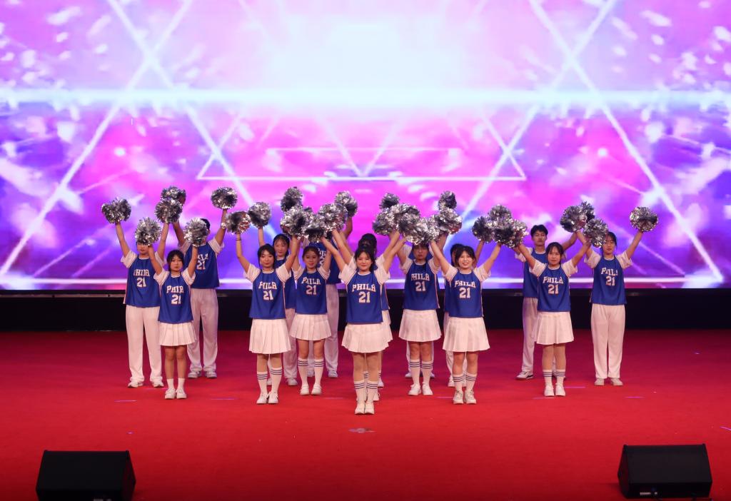 穿着靓丽服装的队员们在舞台上跟着动感的音乐,挥舞着五彩的啦啦球,动作强劲有力,整齐划一,活力四射,充满激情,充分展现了当代大学生健康向上、青春洋溢的精神风貌,为观众呈现了一场充满动感与活力的视觉盛宴。