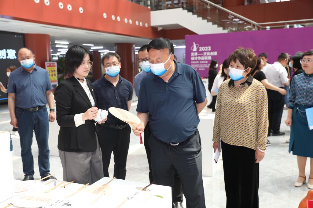 马文刚饶有兴趣地参观展览,不时驻足与主创人员、系部教师进行交流,了解创作背景、参与人员、实用价值等,鼓励教师发挥专业优势,汲取艺术精华,做到教学相长,创作出更多更精彩的作品。