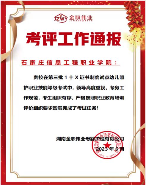 2023年“1+X”幼儿照护职业技能等级证书考试计划获批后,管理系成立了以系主任为组长,综合管理教研室主任刘义青等专业老师为核心成员的“1+X”幼儿照护考试工作小组,制定出严密的工作方案,将“1+X”考试工作分成考试宣传、考生筛选、考前培训、考试筹备及落实几个环节,严格管理,积极推进,层层落实,确保了“1+X”幼儿照护职业技能等级证书(中级)考试工作有序且高效完成,受到了考评组织督导员、考评员的一致好评!