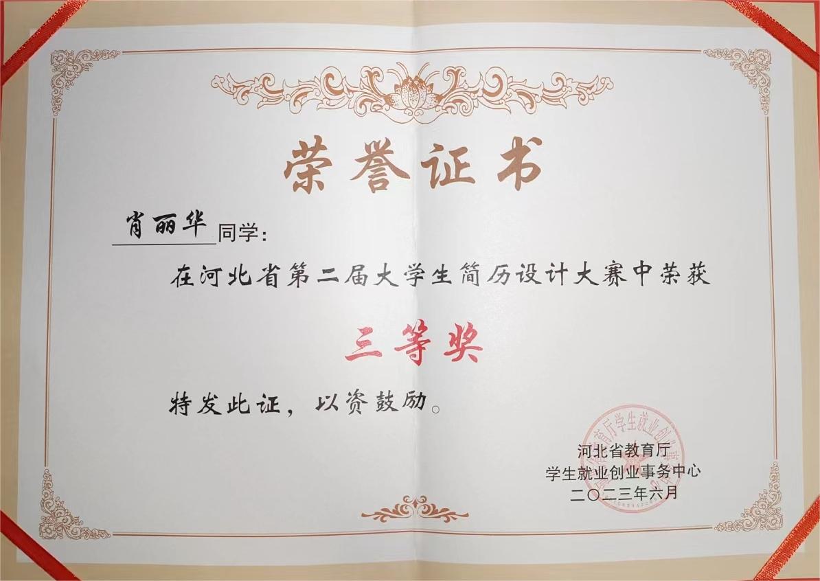 近日,由河北省教育厅主办的河北省第二届大学生简历设计大赛决赛在河北科技大学举行。网络与通信工程系学生肖丽华在决赛中表现优异,荣获三等奖。
