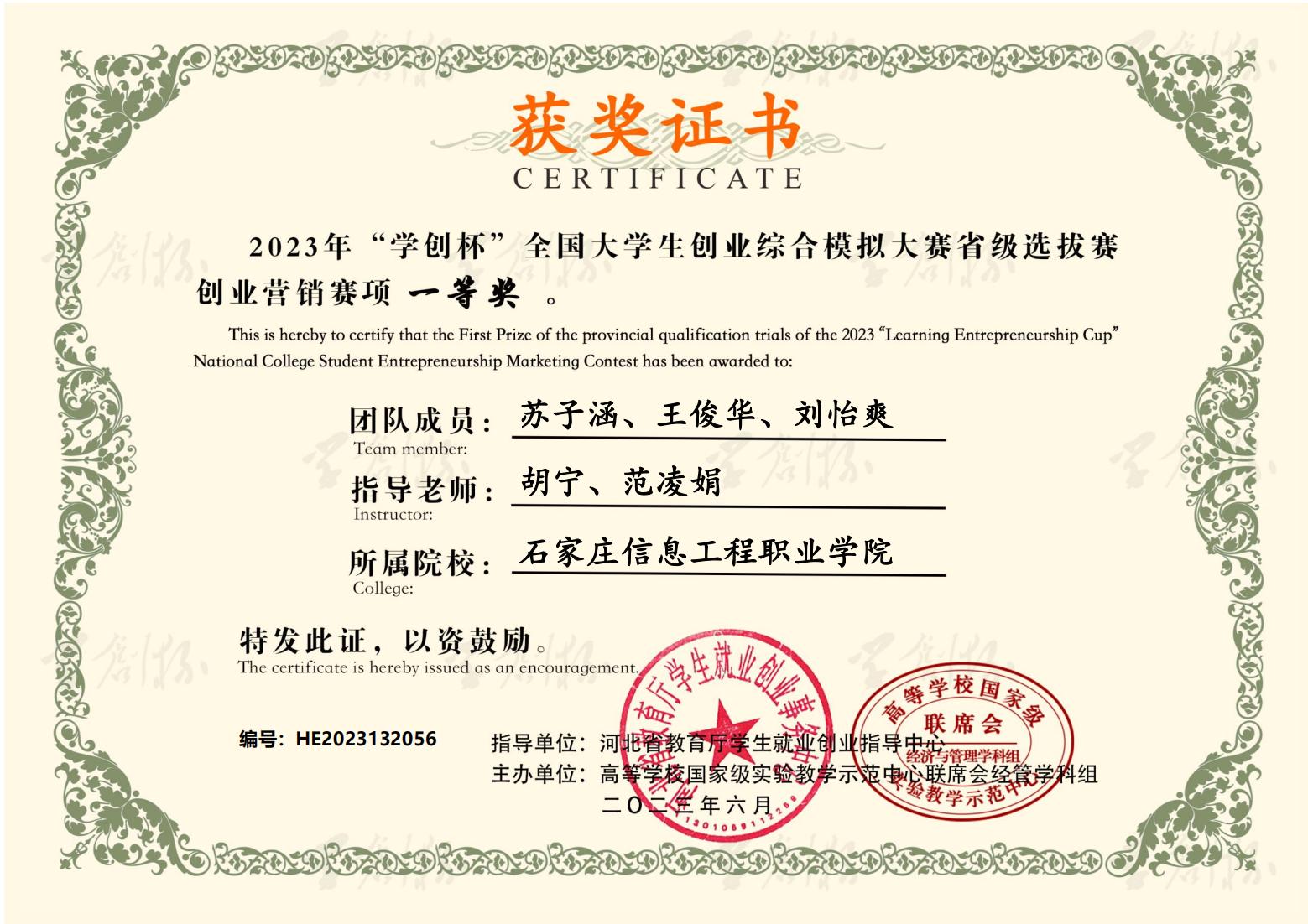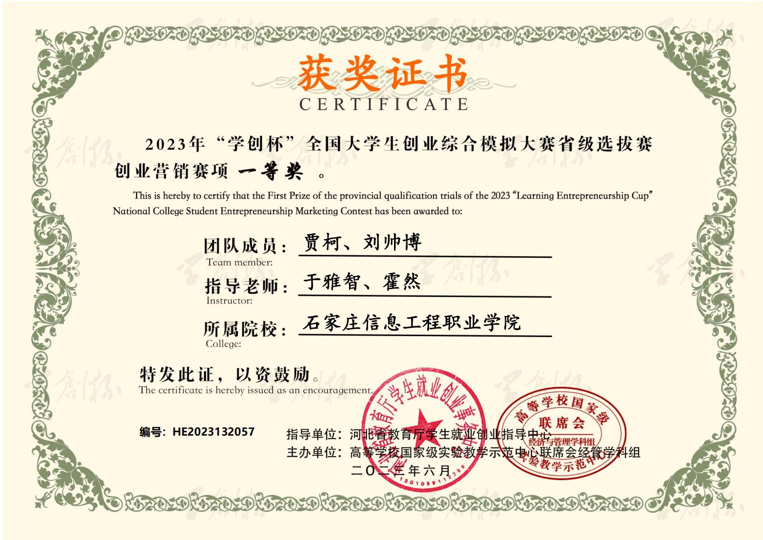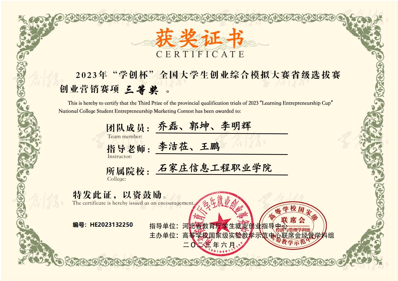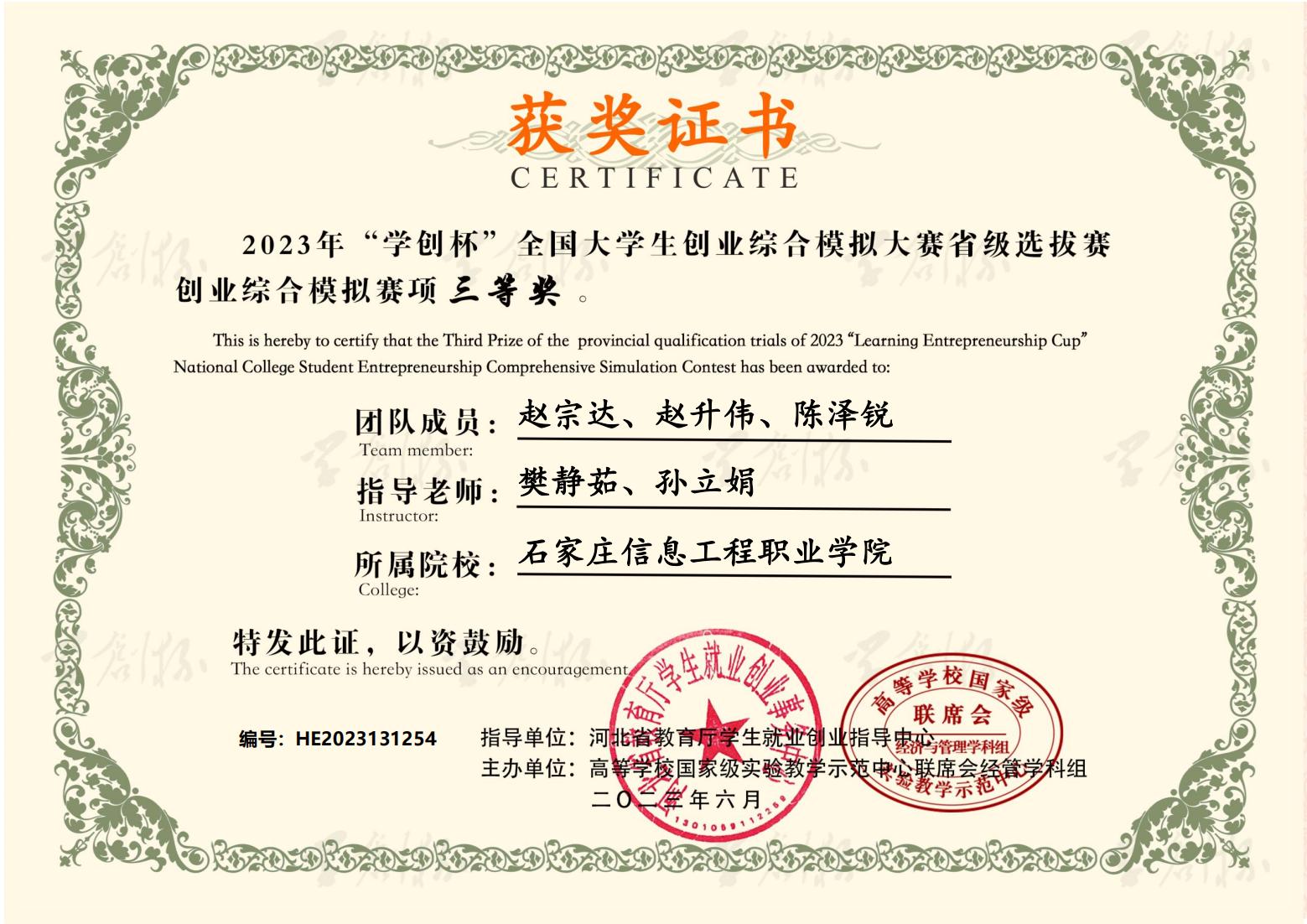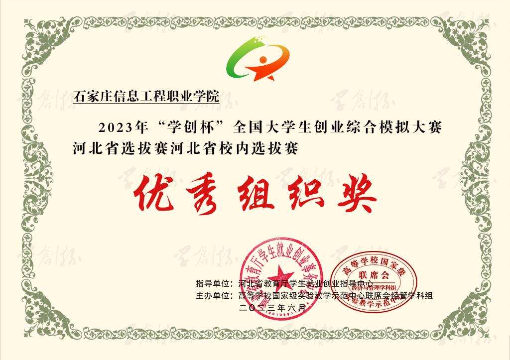 近日,2023年“学创杯”全国大学生创业综合模拟大赛河北省选拔赛圆满落幕。大赛启动以来,世界杯官网积极响应,精心组织,经过校内选拔赛和省赛的激烈角逐,六支参赛队伍共获得一等奖3个,二等奖1个,三等奖2个。同时,获得一等奖的团队指导教师荣获“最佳指导教师”称号,获得二、三等奖的团队指导教师荣获“优秀指导教师”称号。世界杯官网荣获优秀组织奖。