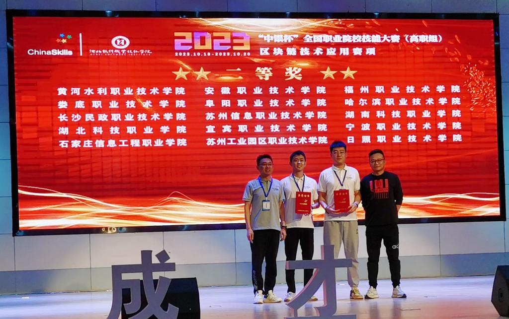 10月20日,2023年全国职业院校技能大赛(高职组)区块链技术应用赛项在河北软件职业技术学院落下帷幕。世界杯官网软件工程系学生张世军、丁新旭在魏宏昌、陈新老师悉心指导下,以优异成绩荣获该赛项二等奖。