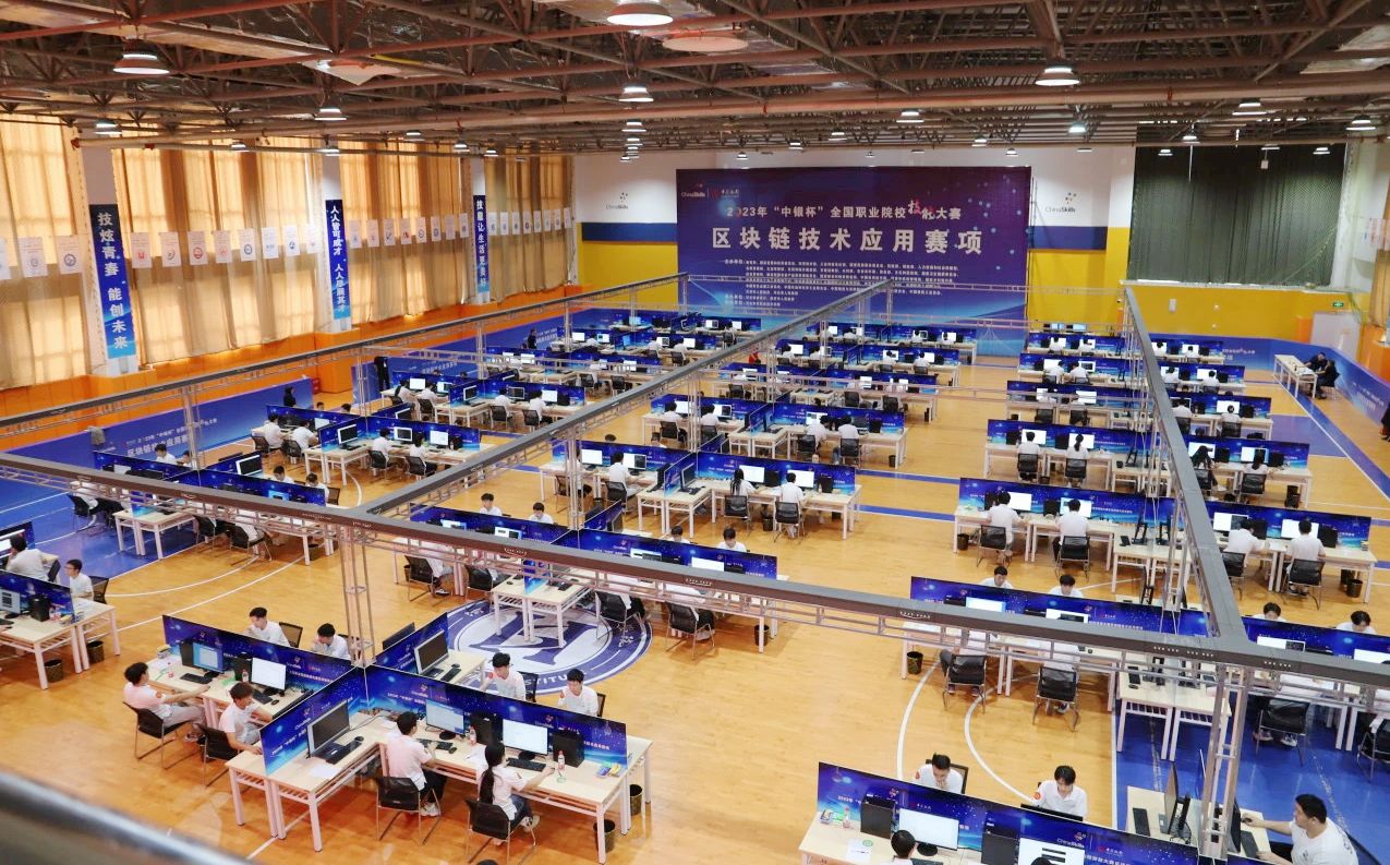 全国职业院校技能大赛由教育部主办,是目前规模最大、影响力最强、技能水平最高的全国性、综合性职业院校技能大赛。“区块链技术应用”赛项为2023年新增国赛项目,来自全国30个省、市、自治区77支代表队的154名选手同台竞技。该比赛为期3天,包括区块链产品方案设计与系统运维、智能合约开发与测试、区块链应用系统开发三个模块,全面考查参赛选手在企业真实项目环境下,对区块链系统应用需求分析与方案设计,区块链应用及智能合约设计与开发,区块链系统测试设计、执行与分析,区块链系统部署、维护和监控,基于区块链系统的应用软件前端与后端开发等专业核心能力及职业素养。