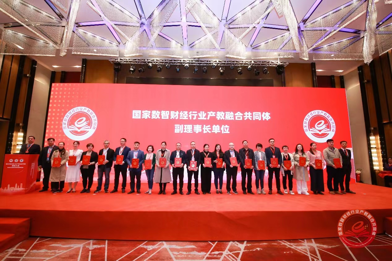 ▲图为国家数智财经行业产教融合共同体启动大会。会计系副主任姜明霞(左三)接受副理事长单位证书。