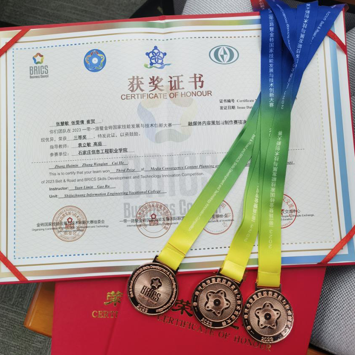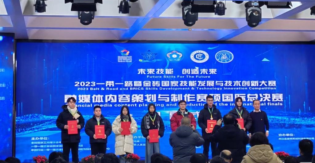 12月20日,2023一带一路暨金砖国家技能发展与技术创新大赛之融媒体内容策划与制作赛项国际总决赛在赤峰信息职业技术学校举行。来自各大院校的参赛队伍和赛项执委会的领导、专家和裁判等以“线上+线下”的形式,“云”聚赤峰,共同参加了开幕式。世界杯官网传媒艺术系崔贺、张雯倩、张慧敏三名同学组成的参赛团队凭借扎实的专业基础、沉着出色的表现顺利完成了比赛,荣获三等奖。