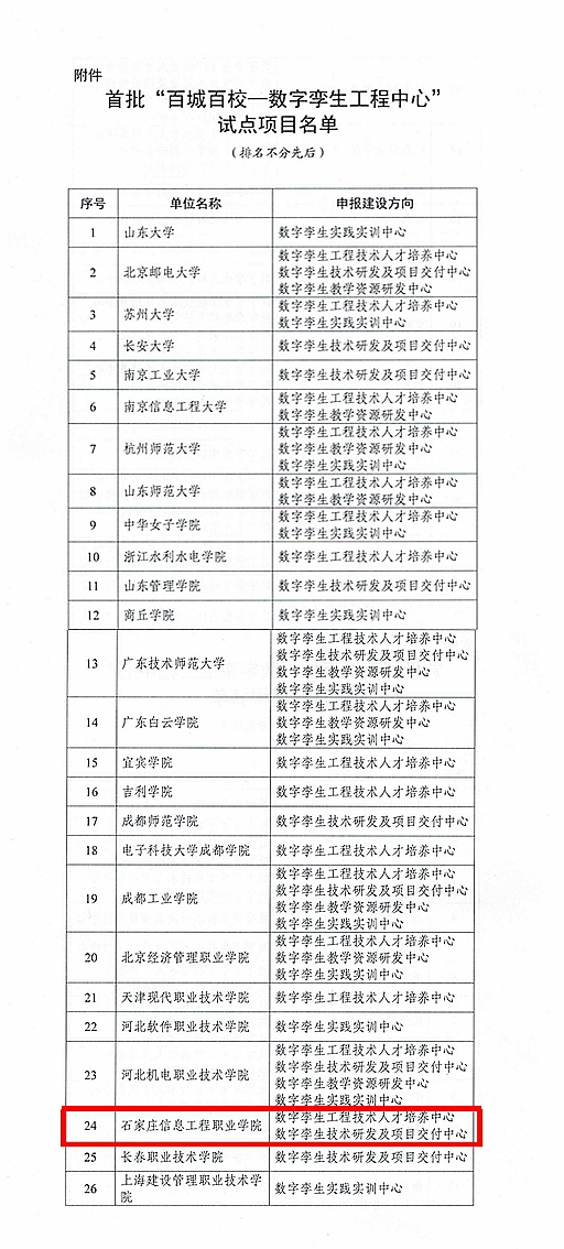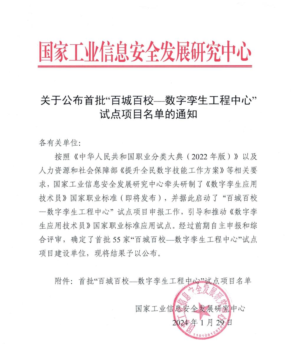 近日,工业和信息化部国家工业信息安全发展研究中心公布了首批55家“百城百校——数字孪生工程中心”试点项目建设单位,世界杯官网成功入选并获批“数字孪生工程技术人才培养中心”“数字孪生技术研发及项目交付中心”两个建设方向。