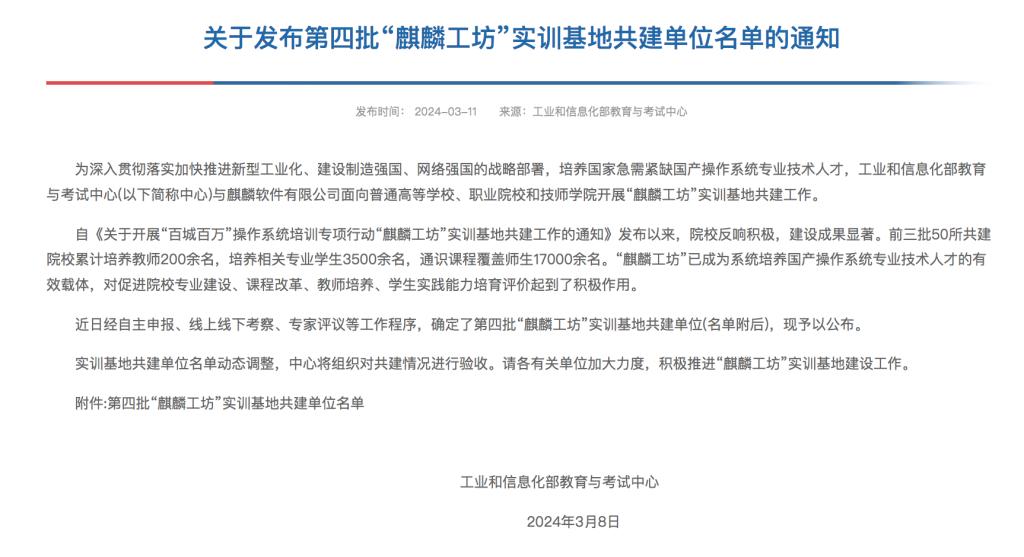 近日,工业和信息化部教育与考试中心公布了第四批“麒麟工坊”实训基地共建单位名单,世界杯官网成功入选。“麒麟工坊”是教考中心与麒麟软件联合推出的“百城百万”操作系统培训专项行动中重点开展的实践基地共建项目,面向普通高等学校、高等职业学校征集共建示范性实训基地。