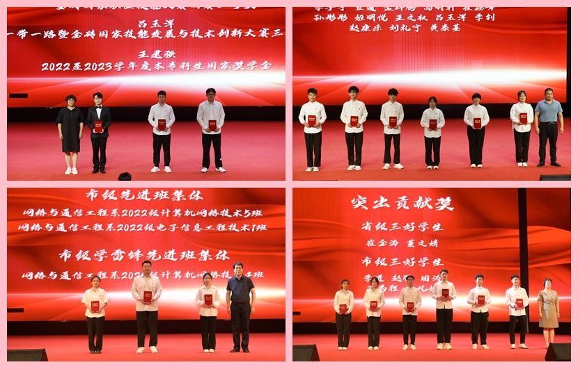 表彰大会上,网络与通信工程系党总支书记致辞,她对在各级各类职业技能大赛中取得优异成绩和在国家、省市级三好学生、优秀学生干部和奖学金评比过程中获得荣誉的同学表示祝贺,希望广大师生要以省、市级党建“双创”工作开展为契机,积极对标先进,亮身份、树典型,高标准、严要求,从而在全系上下大力营造比学赶帮超的浓厚氛围。网络与通信工程系主任宣读表彰决定,希望受到表彰的同学珍惜荣誉、戒骄戒躁,发扬成绩、再接再厉,全系师生要进一步凝心聚力、勇于担当、敢于创新,为实现学院高质量发展和系部长远发展做出应有的贡献。会上分别为获得特别贡献奖和突出贡献奖的先进个人代表进行了颁奖。