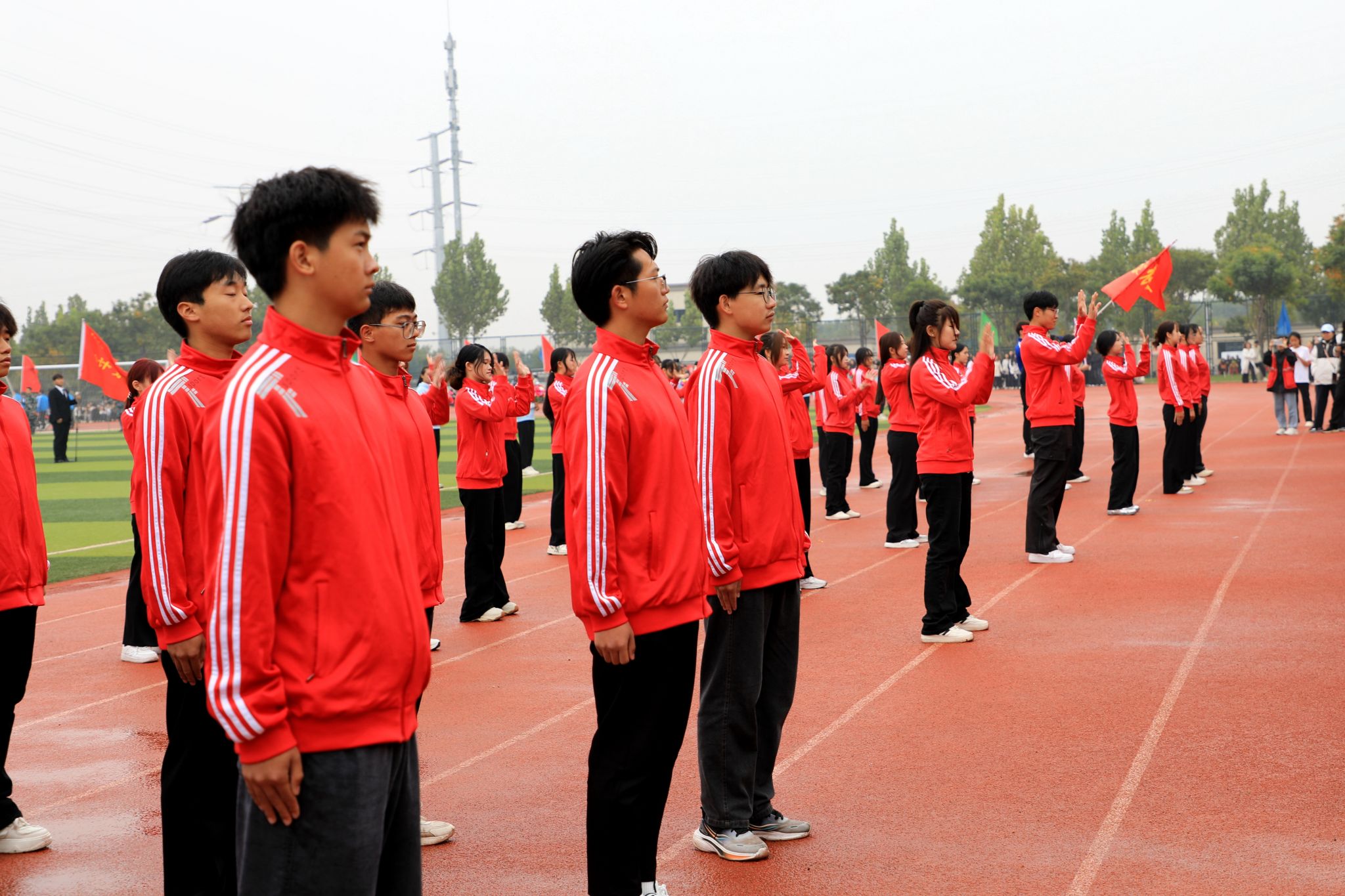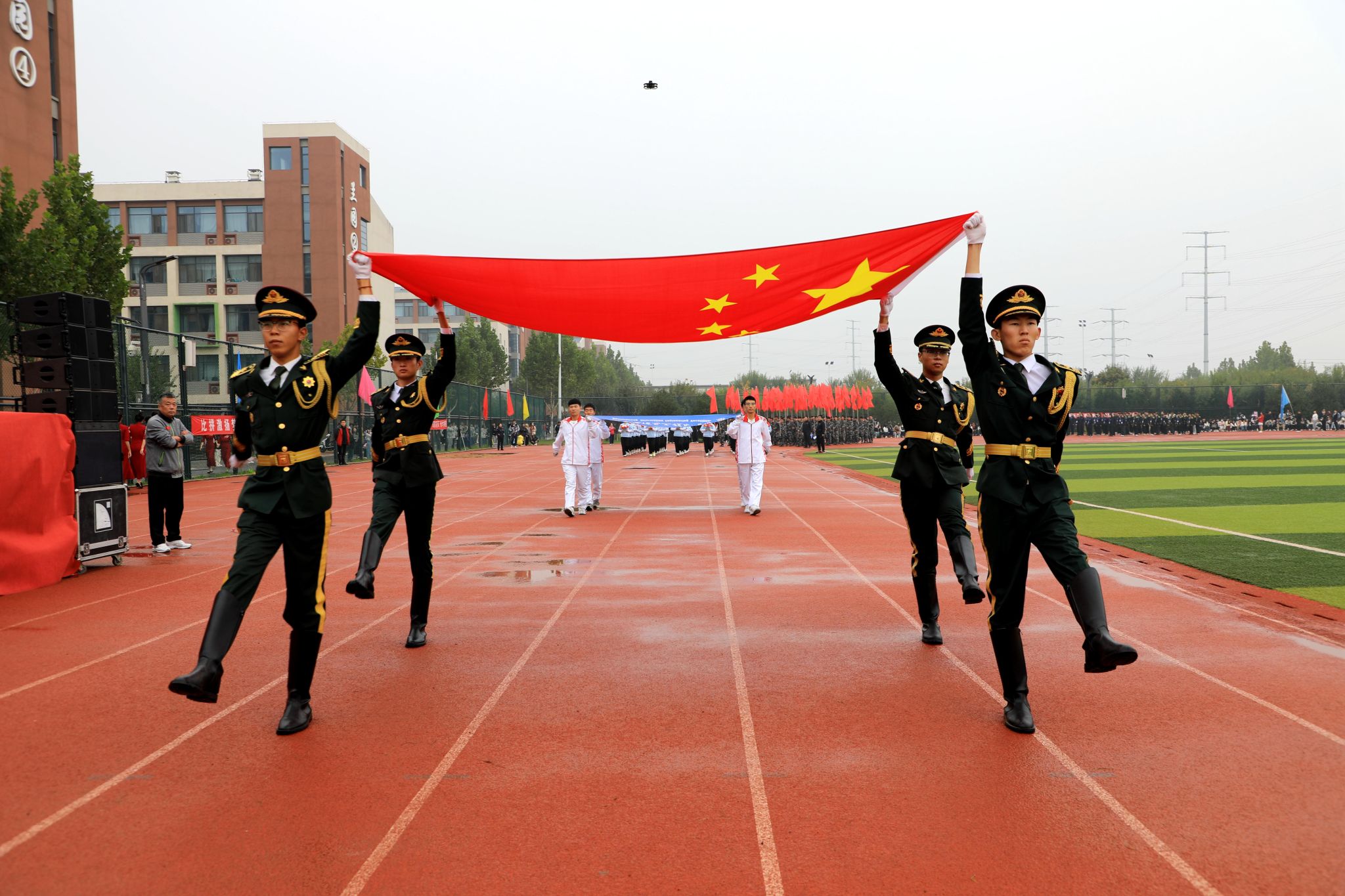 伴着庄严的《义勇军进行曲》,全场起立,行注目礼,鲜艳的五星红旗冉冉升起,随风飘扬。