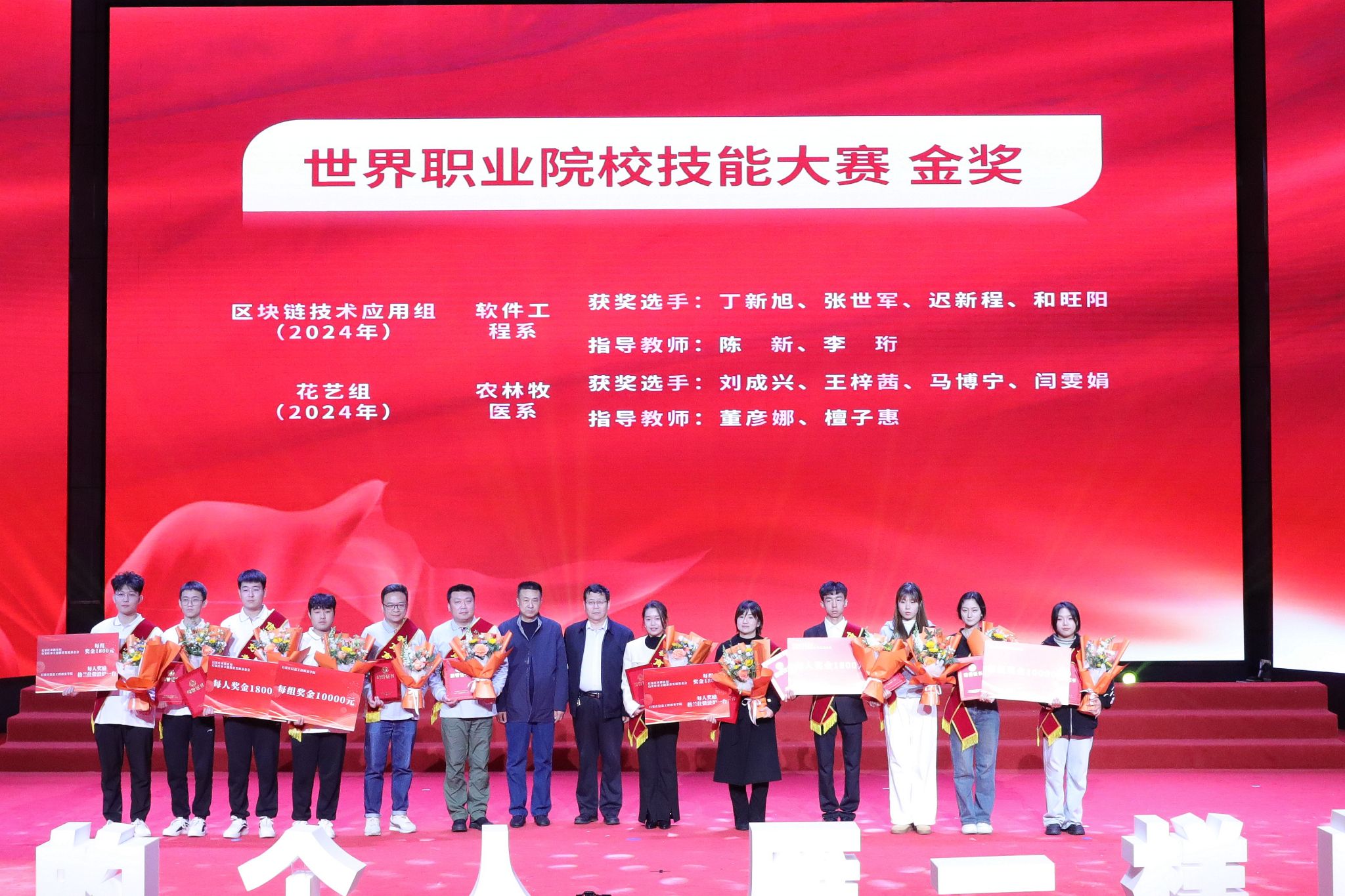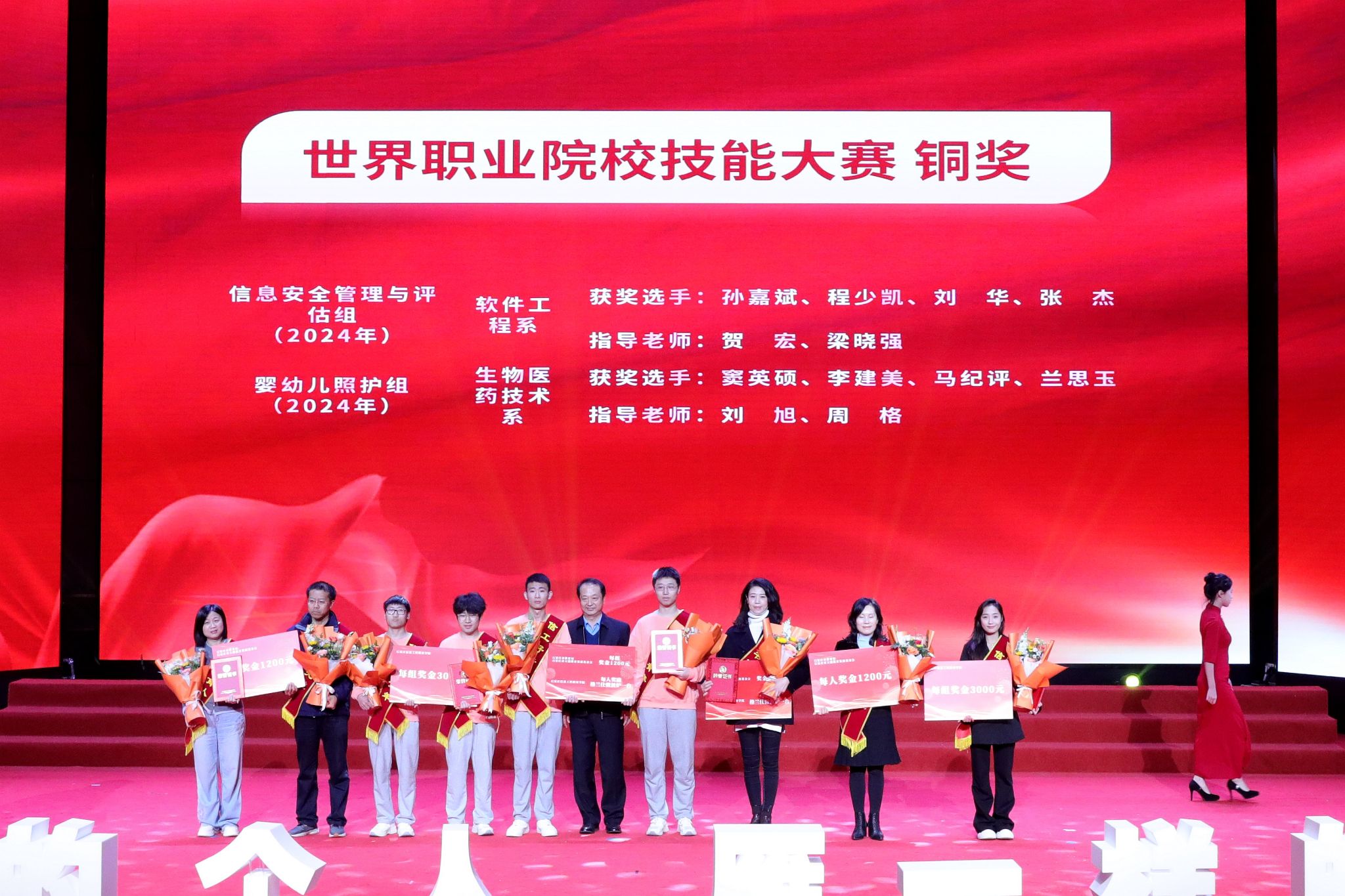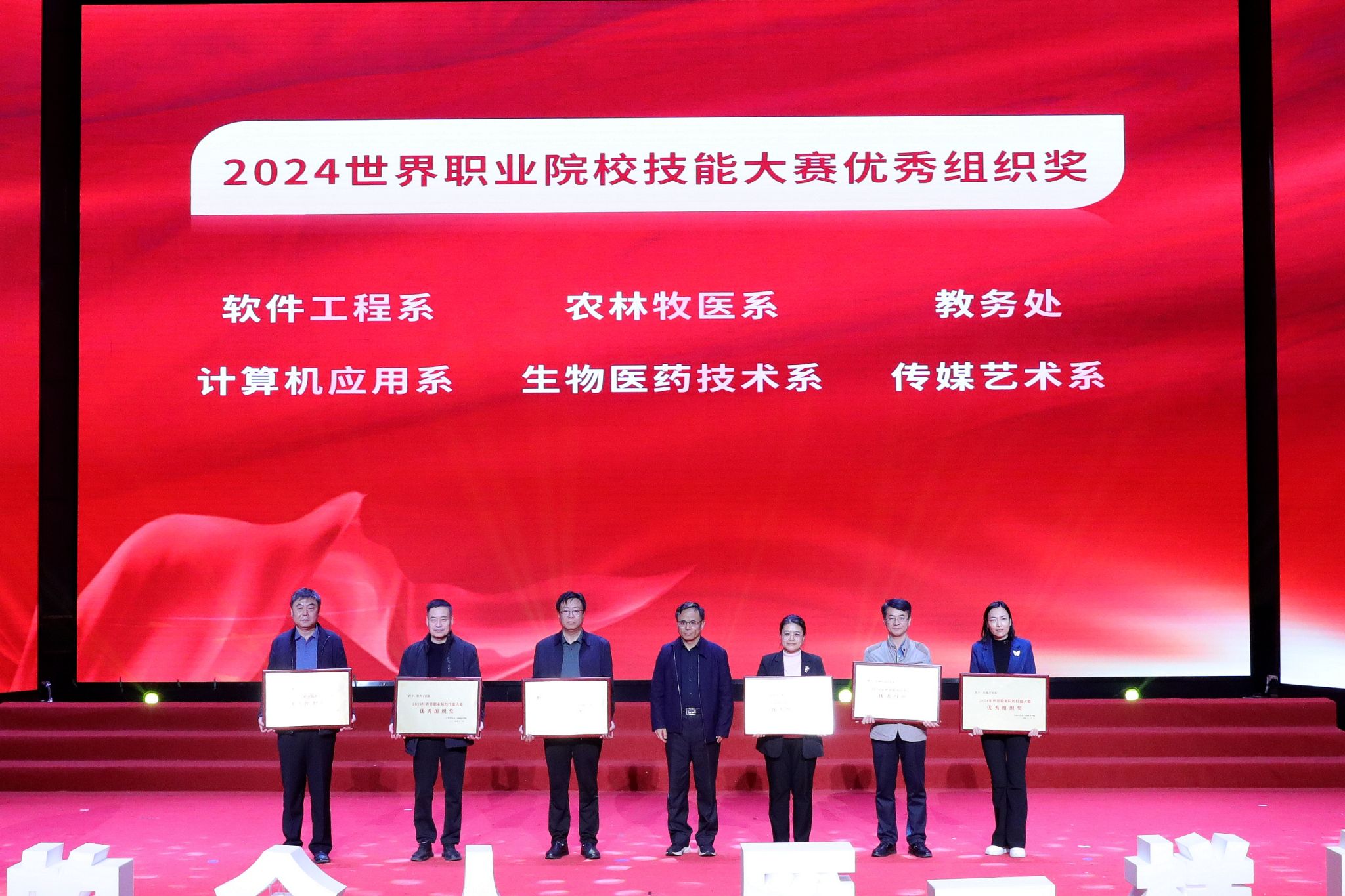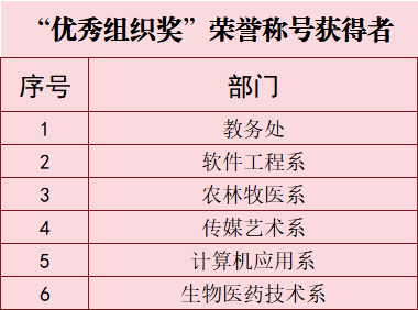 大会宣读了《中共2026世界杯官方合作网站委员会关于表彰2023年全国职业院校技能大赛和2024年世界职业院校技能大赛获奖学生、指导教师和优秀组织部门的决定》。决定授予在职业院校技能大赛国赛中获奖的33名学生“信工好青年”荣誉称号。授予获得金奖团队的4名指导教师“教书育人楷模”荣誉称号;授予获得银奖团队的3名指导教师“教书育人模范”荣誉称号;授予获得铜奖团队的10名指导教师“教书育人先进”荣誉称号。授予在大赛组织中做出突出贡献的教务处、软件工程系、农林牧医系、传媒艺术系、计算机应用系、生物医药技术系6个部门“优秀组织奖”。