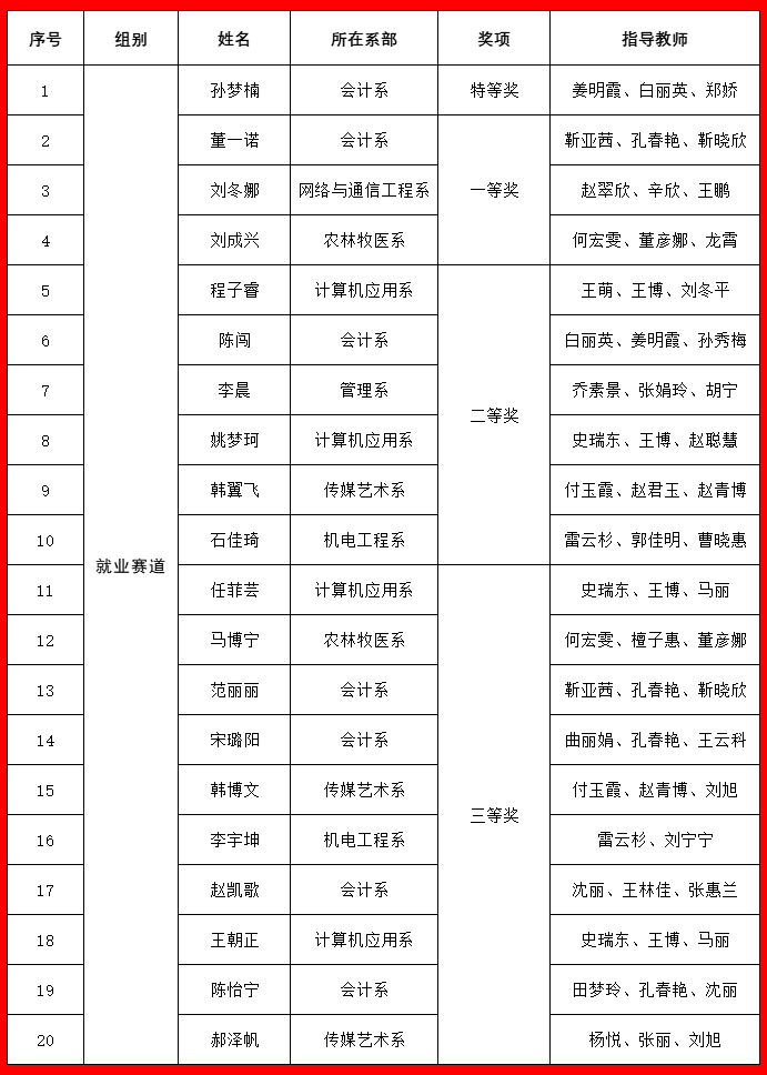 本次大赛以“筑梦青春志在四方 规划启航职引未来”为主题,分为成长赛道和就业赛道,旨在进一步强化大学生职业规划意识与创新创业能力,引导广大青年学子树立正确的成才观、就业观和择业观。大赛自启动以来,学院高度重视,招生就业指导中心精心组织,各系广泛动员,吸引了16000余名学生报名参赛。经过系赛、校级复赛的选拔,成长赛道和就业赛道各有20名选手进入校赛决赛。经过激烈角逐,两个赛道各产生特等奖1名,一等奖3名,二等奖6名,三等奖10名。