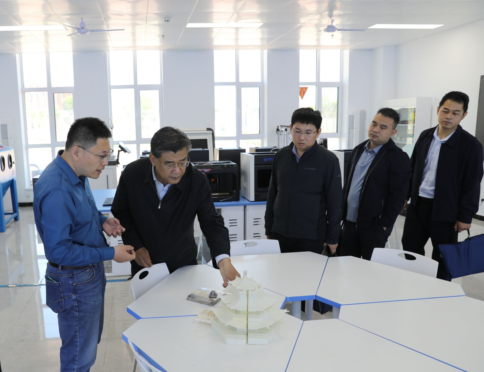 马誉辉一行参观了学院工程实训中心、无人机实训中心,就空天信息发展、应用场景、制约因素等进行调研。