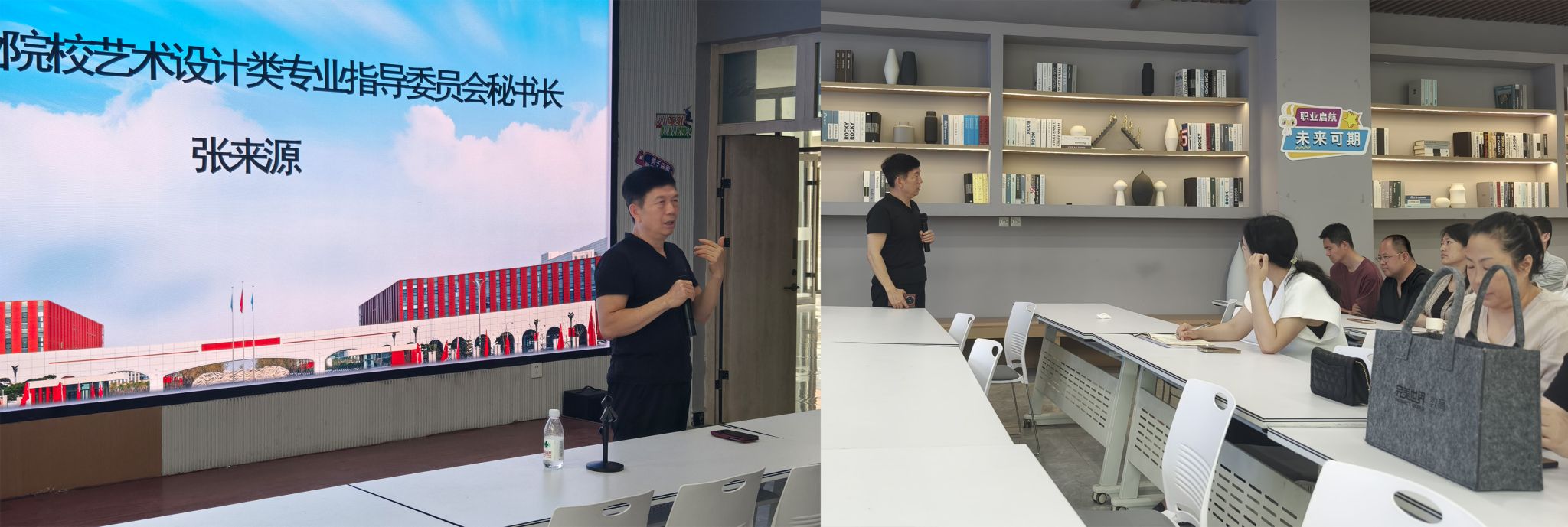 下午,张来源围绕着“服务区域产业打造数字创意内容生成资源体系建设”为传媒艺术系全体教师进行讲座,讲述了数字化转型时代艺术设计职业教育发展的前沿理念。他以职业大赛中的典型案例强调,艺术设计类专业发展应匹配区域重点产业,强化创意的挖掘与表达,注重从当代社会议题和生活实践中汲取灵感,探索多场景、交互性视觉设计等创新方向,借助智能工具推动创意生产的深度落地,培养适应区域产业升级的应用型数字艺术设计人才,推动设计服务与区域经济高质量协同发展。现场氛围热烈。