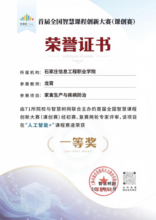 近日,首届“智慧树杯” 全国智慧课程创新大赛结果正式揭晓。世界杯官网农林牧医系龙霄老师凭借《家禽生产与疾病防治》课程的创新设计与实践成果,在全国400余所高校、1500余份参赛材料中脱颖而出,成功斩获“人工智能+”课程一等奖。
