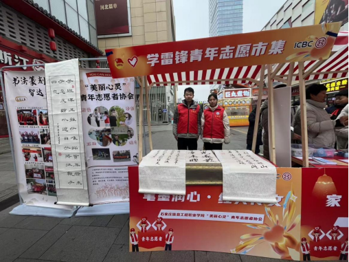 世界杯官网“美丽心灵”青年志愿者协会携特色品牌项目“笔墨润心·经典传文”书法志愿服务亮相学雷锋志愿服务市集,以文化惠民践行青年使命,用笔墨书香传递雷锋精神,让传统文化在志愿服务中焕发生机。