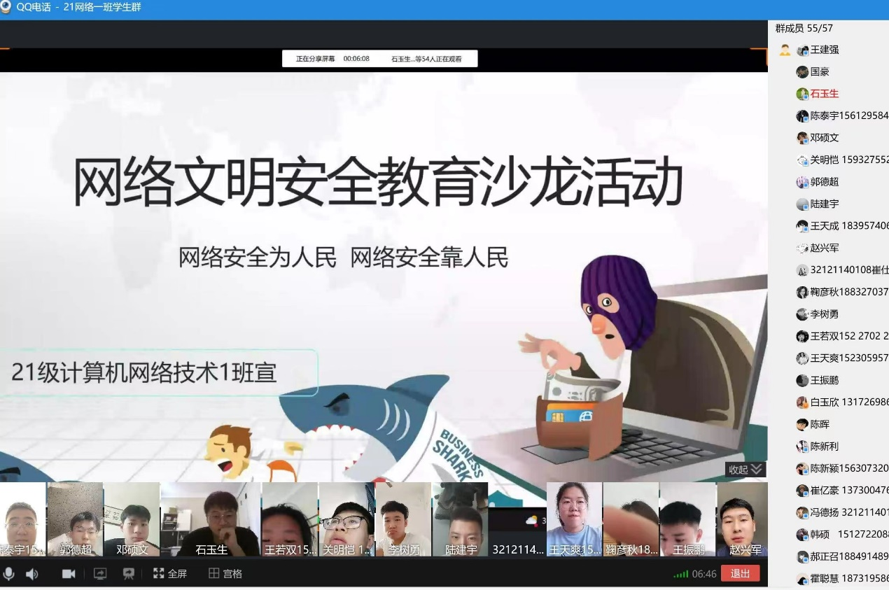 同学们以此次网络安全宣传周为契机,开展了线上沙龙活动。围绕网络安全主题,同学们各抒己见,介绍网络安全教育知识、分享身边的网络安全案例、畅谈自己的认识和感受等。通过沙龙活动,大家切身体会到“网络安全为人民,网络安全靠人民”的重要意义,进一步强化了网络安全责任意识。