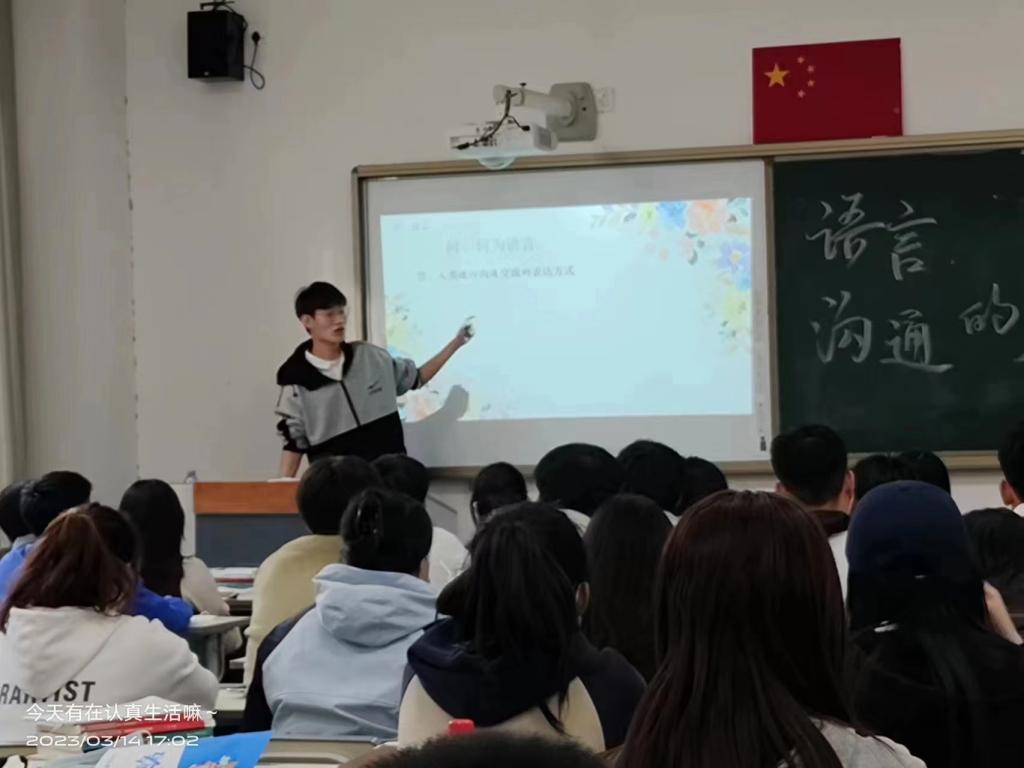 学生理论宣讲团吕泽龙同学讲解了语言的发展历程,语言的构成,语言表达的艺术,并且借语言的艺术魅力拓展到语言朗诵以及辩论赛,进一步展现了语言在沟通交流中的巨大作用,引导同学们爱上语言表达,学会合理运用语言艺术。