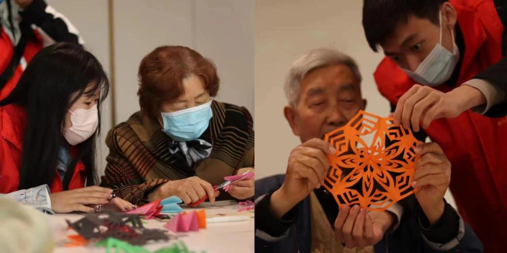 活动中,剪纸小组的同学们和老人一起剪窗花,通过耐心细致的示范和讲解,详细地展示剪窗花的各项步骤,老人们积极参与其中,一张彩纸、一把剪刀,在老人们的手中,经过折叠、描图、裁剪等工序,很快就变成为一幅幅惟妙惟肖、形象生动、内容丰富的精美窗花。书法小组的同学和老人一起探讨交流书法,此次活动吸引了很多热爱书法的老人参加。