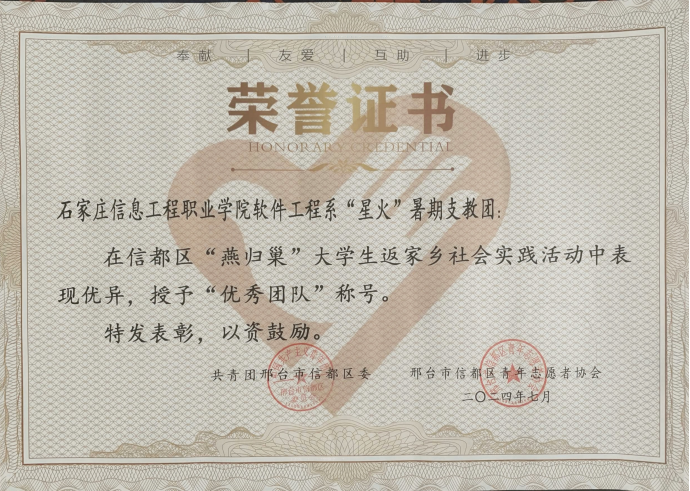 支教团成员表现出的团结互助、扎实认真、乐观好学的精神赢得了邢台市信都区委、学生及家长的赞誉。团队荣获“邢台市信都区‘燕归巢’大学生返家乡社会实践‘优秀团队’”称号,活动报道先后被中国青年报、河北日报、河北新闻网、邢台市市委宣传部、邢襄青年、牛城晚报、冀云客户端等多家网络媒体关注。