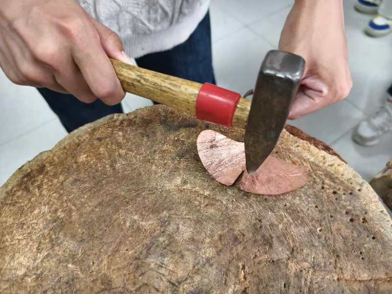 活动中,师生们体验了铜树叶、羽毛书签和浮雕画的制作流程。一块铜板,经过同学们的敲敲打打,很快就变成了色彩斑斓、惟妙惟肖的工艺品。