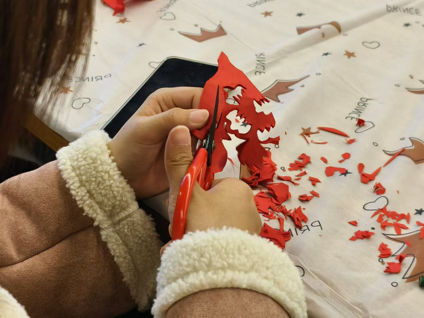 王丽云老师首先对纯剪刀剪纸特点做了介绍,并以牡丹团花为例,讲解制作流程和技巧,并现场示范了三种常见剪法。随后,大家动手尝试,发挥想象力进行图案重构,一个个形态各异的剪纸作品随之诞生。