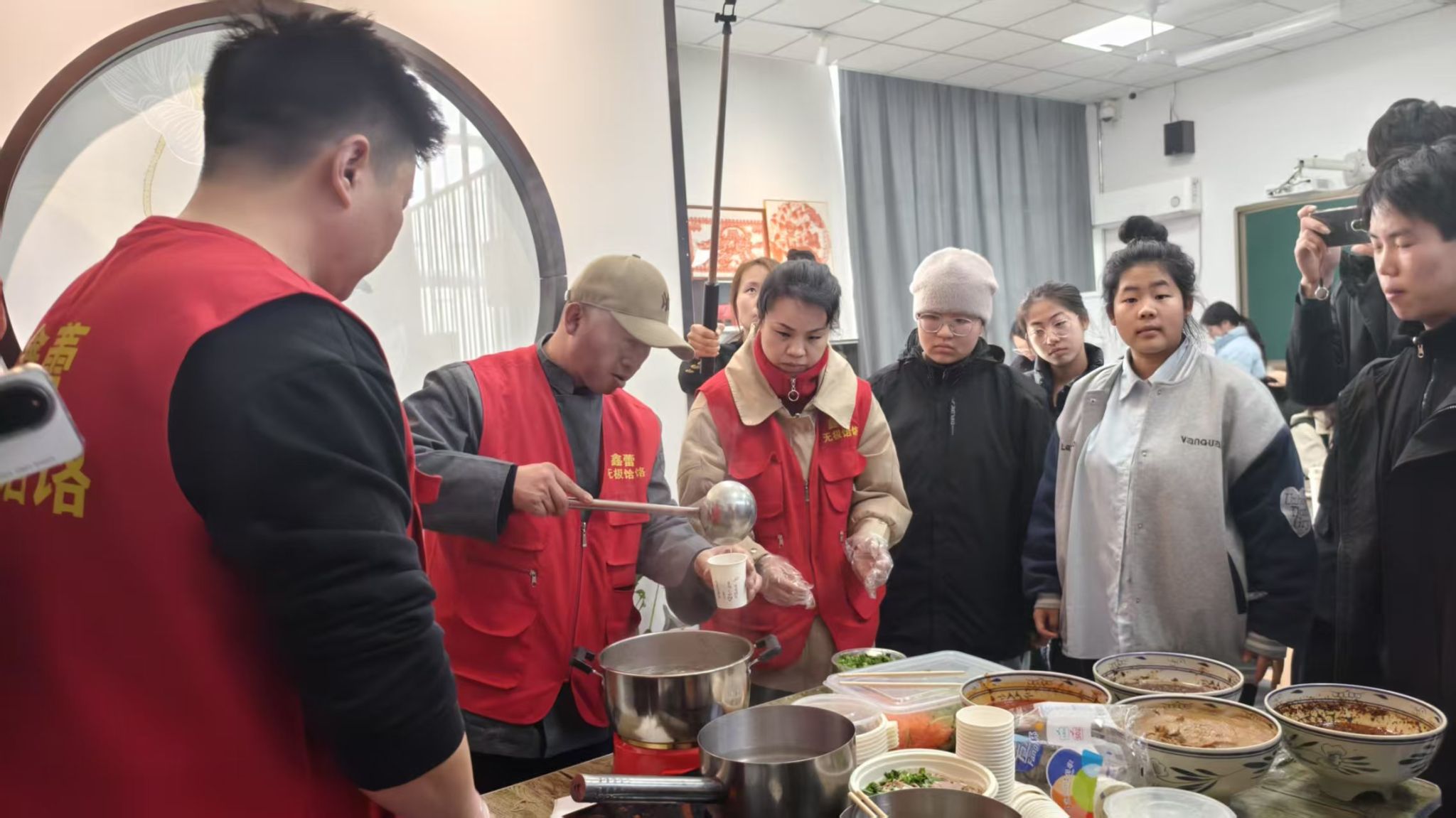饸饹,古称“河漏”,是用荞麦面、红薯面或莜麦面做原料,用榆皮面做粘合剂和面,经特制工具轧制而成的一种面食。从饸烙的起源到营养价值和制作工艺,从饸烙的技术革新到未来产业发展,张老师一边制作,一边展示,热情地邀请师生品尝不同原料配比的饸烙口感。从凉拌饸烙吃到麻酱饸烙,再从打卤饸烙吃到牛汤饸烙,无极饸饹口感筋道、软而不黏,醇厚的风味吸引了众多“食客”驻足品尝。