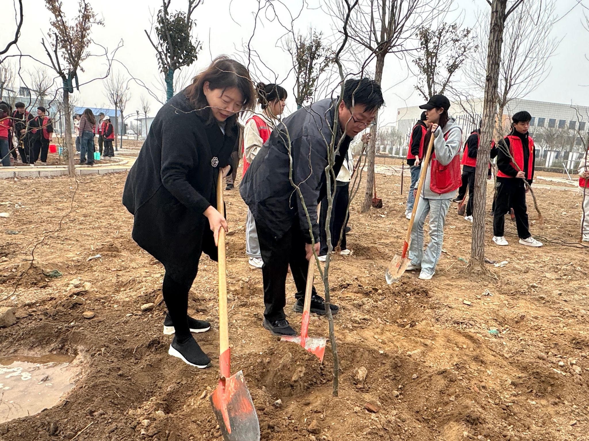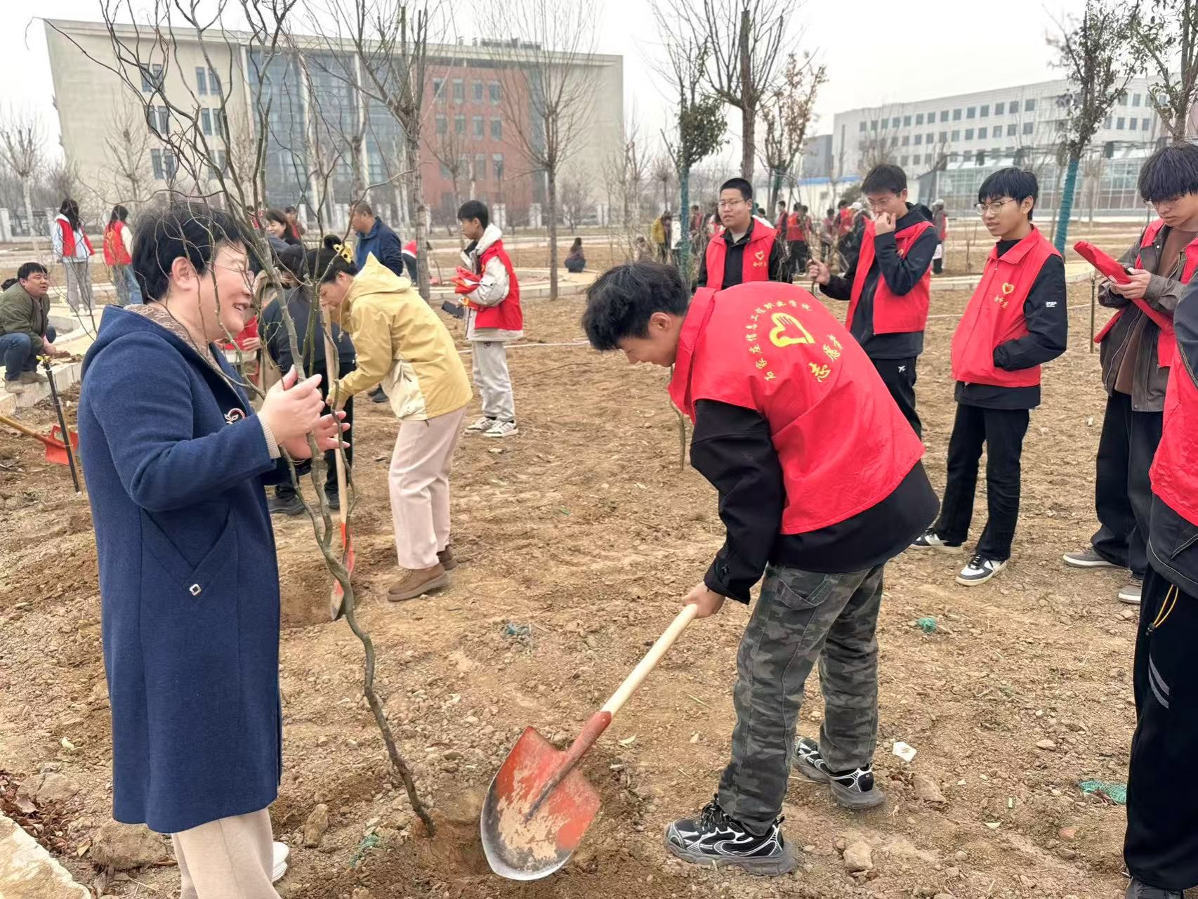 植树现场,师生们热情高涨,迅速分成小组,投入到义务植树的火热劳动中。他们有的挥锹铲土,有的扶苗种树,有的铲土培实,有的提桶浇水……大家分工井然,配合默契,各环节衔接流畅,齐心协力将一棵棵龙柳树苗精心栽植于土壤之中。