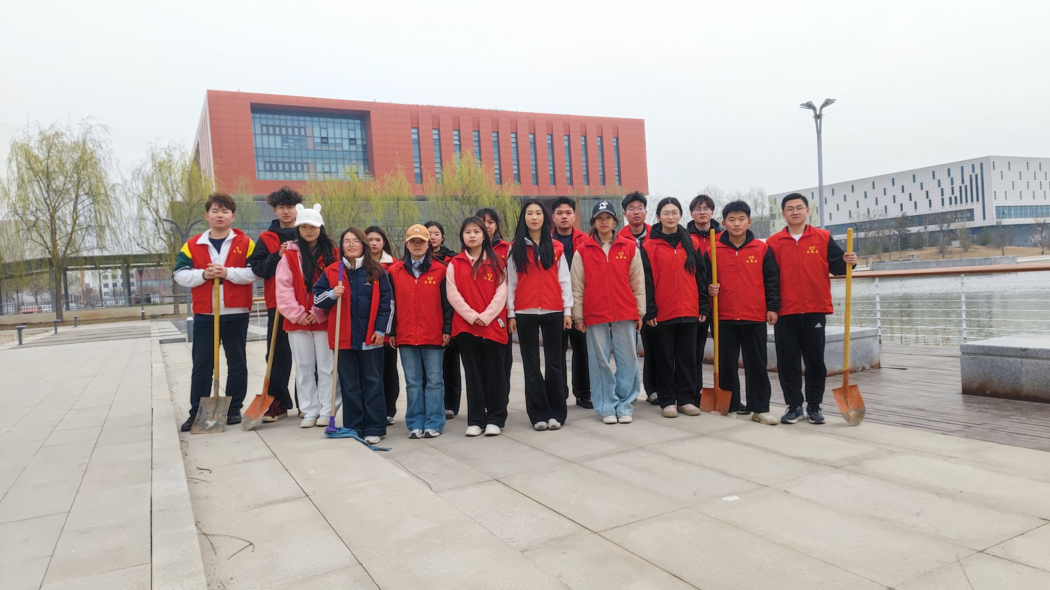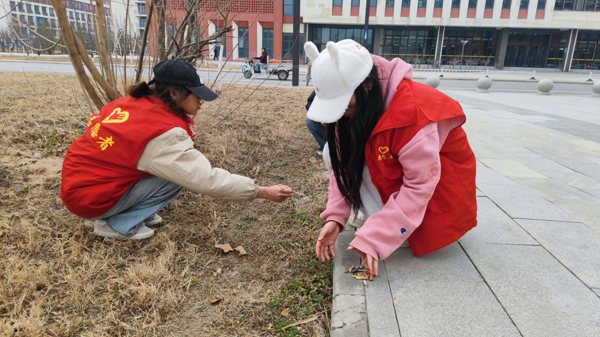 志愿者们身穿红色马甲,手持清扫工具,全身心投入到清洁工作中。他们两人一组或三五成群,沿着知海湖边仔细搜寻隐匿在草丛和石缝中的各种垃圾,全然不顾脏污,用工具或是徒手将垃圾捡起并收集到附近的垃圾桶内。活动过程中,尽管天气寒冷,但同学们齐心协力,相互配合,用汗水换来了知海湖边环境卫生的进一步改善。