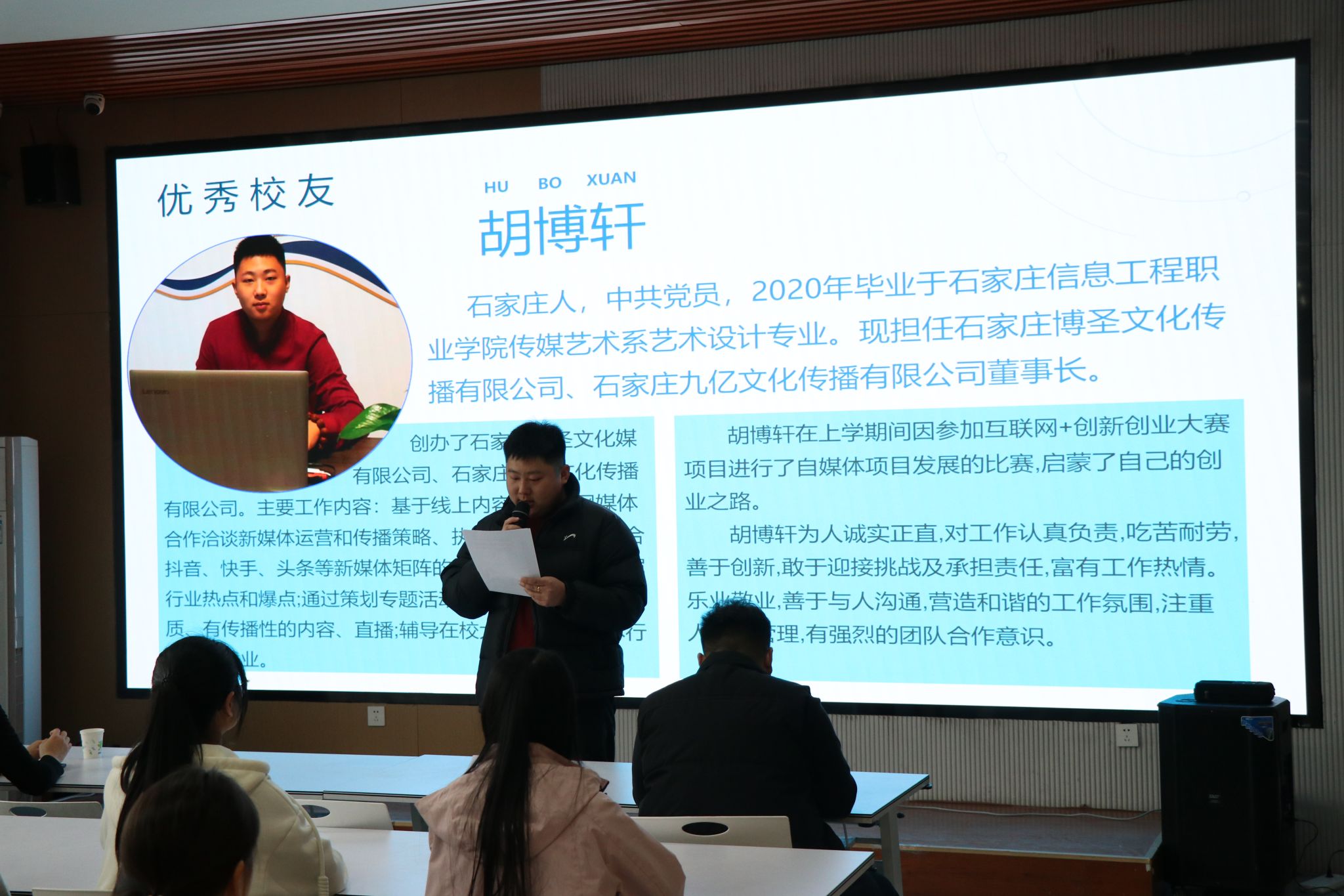 为搭建校友与在校生交流平台,激发学生创新创业热情,3月12日下午,传媒艺术系“艺新讲堂”在知新8-108室举办“青春创未来”优秀校友面对面活动。传媒艺术系党总支书记张婷,副书记刘旭出席活动,80余名师生共同聆听2020届优秀毕业生——石家庄博圣文化传播有限公司、石家庄九亿文化传播有限公司创始人胡博轩与石家庄九亿文化传播有限公司总经理刘旭分享的创业故事,共话青春成长与行业未来。