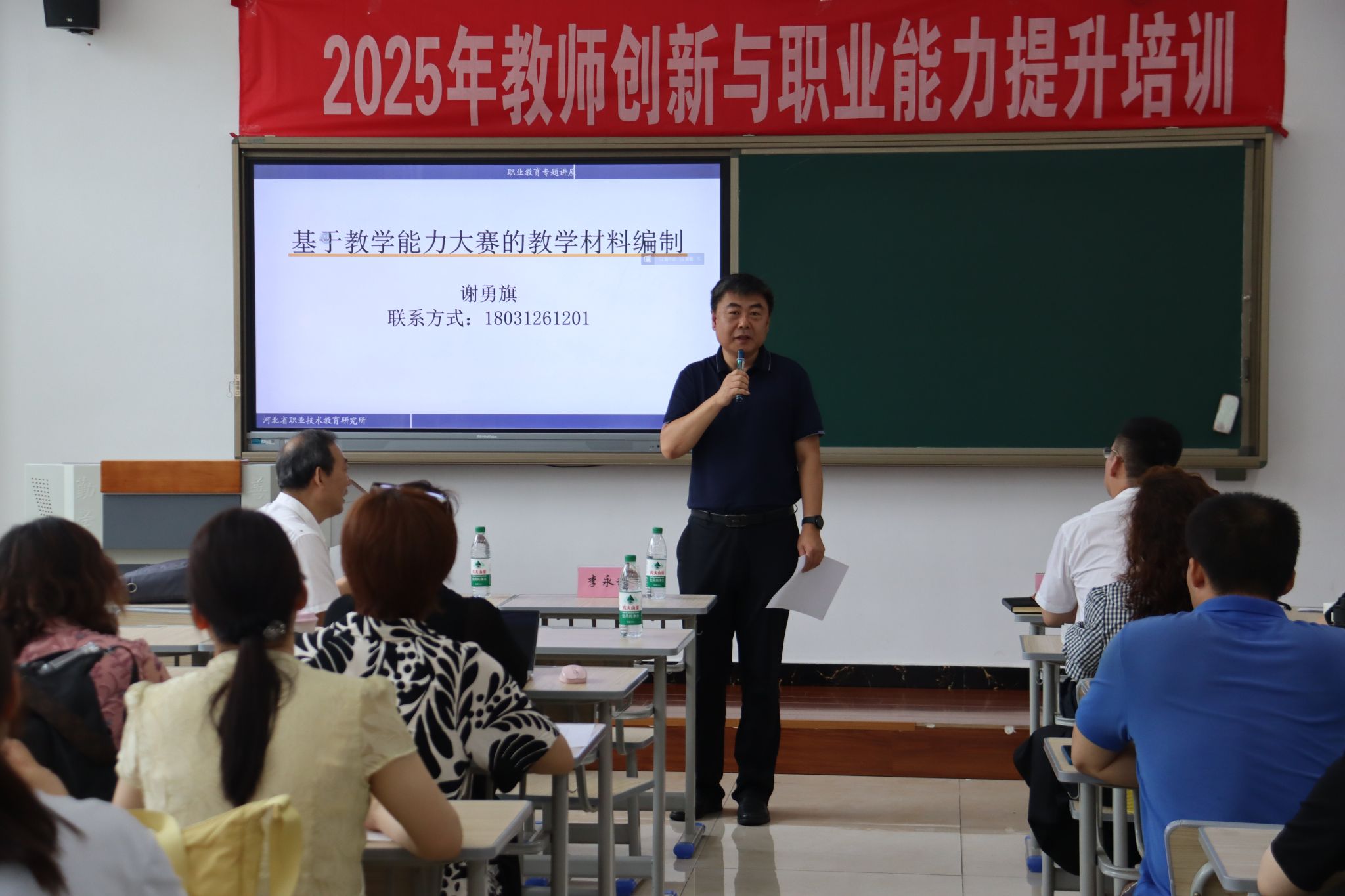 7月3日上午,河北师范大学职业技术教育研究所副所长谢勇旗教授带来主题为“基于教学能力大赛的教学材料编制”的讲座。谢教授结合自身丰富的教学经验和对教学能力大赛的深入研究,详细解读了教学材料编制的关键要素,包括教学设计、教学实施报告、教案编写以及教学资源开发等方面的要求与技巧。为教师在教学材料编制方面提供了清晰的思路和实用的方法。