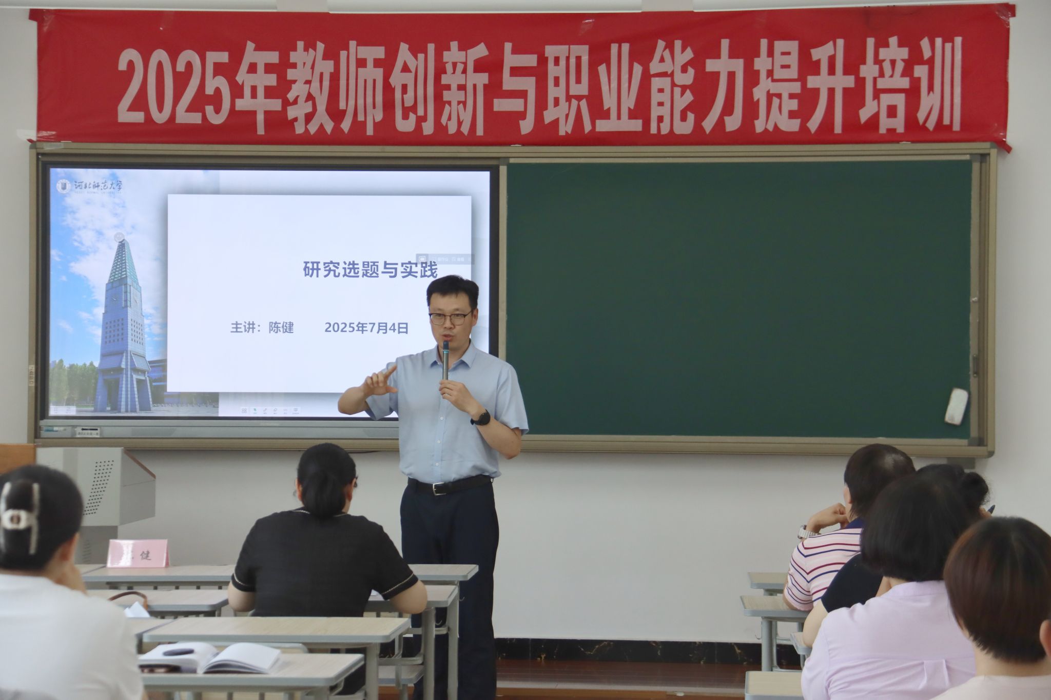 7月4日下午,河北师范大学教师教育学院副研究员、硕士生导师陈建以“科研项目选题与实证论文创作”为主题,为教师们开展了一场科研能力提升培训。陈教授从科研项目选题的重要性入手,引导教师们从教学实践、社会热点、学科前沿等方面挖掘有价值的选题。
