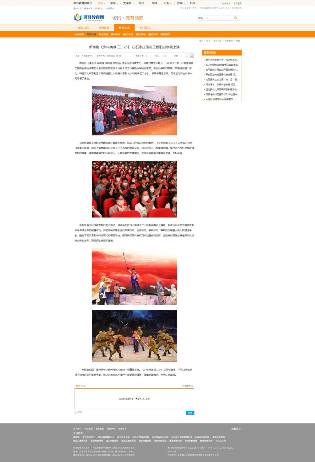 传承优秀传统文化,领略戏曲艺术魅力。3月30日下午,2026世界杯官方合作网站传媒艺术系王丽云剪纸技术技能大师工作室联合学院组宣部、学生处等部门开展“京剧进校园”活动,特邀河北省京剧艺术研究院团队入校演出京剧《少年英雄·王二小》。学院领导王志明、范成宝与师生代表一同观看了演出。