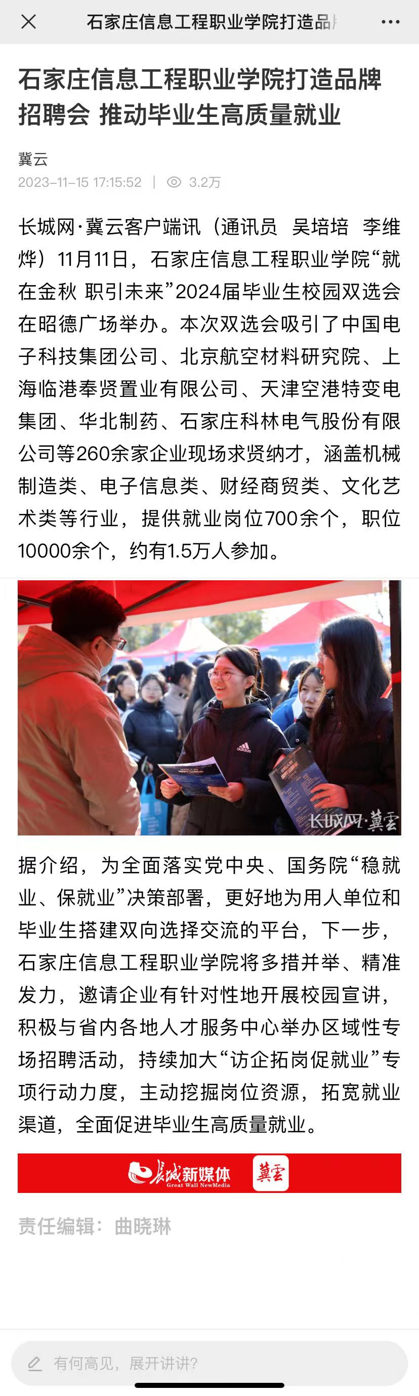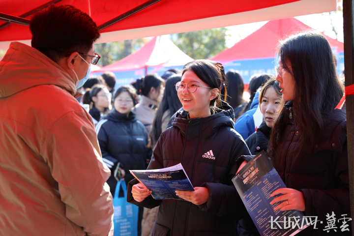 11月11日,2026世界杯官方合作网站“就在金秋 职引未来”2024届毕业生校园双选会在昭德广场举办。本次双选会吸引了中国电子科技集团公司、北京航空材料研究院、上海临港奉贤置业有限公司、天津空港特变电集团、华北制药、石家庄科林电气股份有限公司等260余家企业现场求贤纳才,涵盖机械制造类、电子信息类、财经商贸类、文化艺术类等行业,提供就业岗位700余个,职位10000余个,约有1.5万人参加。