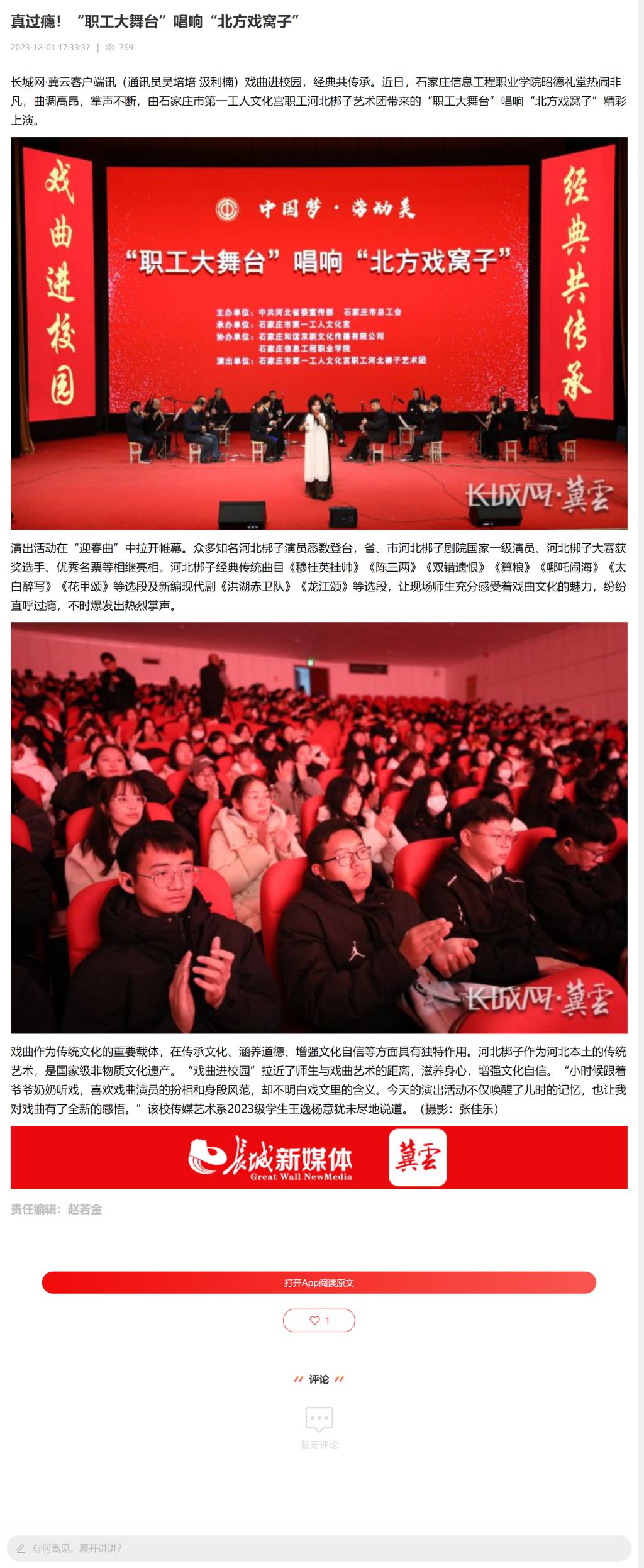 戏曲作为传统文化的重要载体,在传承文化、涵养道德、增强文化自信等方面具有独特作用。河北梆子作为河北本土的传统艺术,是国家级非物质文化遗产。“戏曲进校园”拉近了师生与戏曲艺术的距离,滋养身心,增强文化自信。“小时候跟着爷爷奶奶听戏,喜欢戏曲演员的扮相和身段风范,却不明白戏文里的含义。今天的演出活动不仅唤醒了儿时的记忆,也让我对戏曲有了全新的感悟。”该校传媒艺术系2023级学生王逸杨意犹未尽地说道。