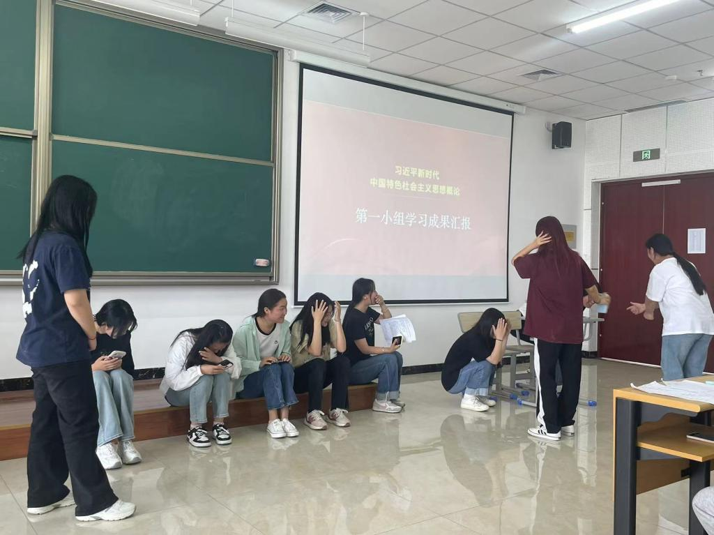 同学们以学习小组为单位,自主选题,设计场景,以情景剧、小品、三句半、相声、皮影戏、音乐剧、手势舞、诗歌朗诵等丰富多彩的“路演”形式在课堂上进行汇报。课堂上,学生热情洋溢,课堂氛围热烈,内容紧跟时代,主题鲜明,学生们用自己的方式诠释了对中国式现代化、中国梦、生态文明、乡村振兴等课程内容的深刻理解。