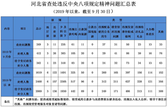 2019年9月,我省查处违反中央八项规定精神问题249件,处理412人,给予党纪政务处分342人。截至9月30日,我省查处违反中央八项规定精神问题情况如下:
