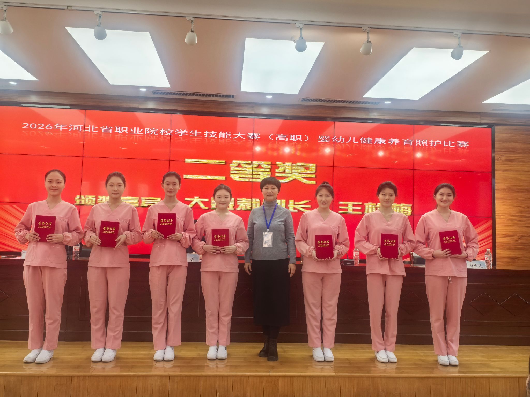 近日,由河北省教育厅主办,河北省卫生职业教育集团、河北女子职业技术学院承办的2026年河北省职业院校技能大赛(高职)婴幼儿健康养育照护比赛成功举办。来自全省11所高职院校的参赛队伍同台竞技,世界杯官网生物医药技术系婴幼儿托育服务与管理专业张子涵、黄亚美、段希媛三名同学组成的参赛团队,在刘旭、栗慧萍老师的指导下,顽强拼搏,斩获大赛二等奖。