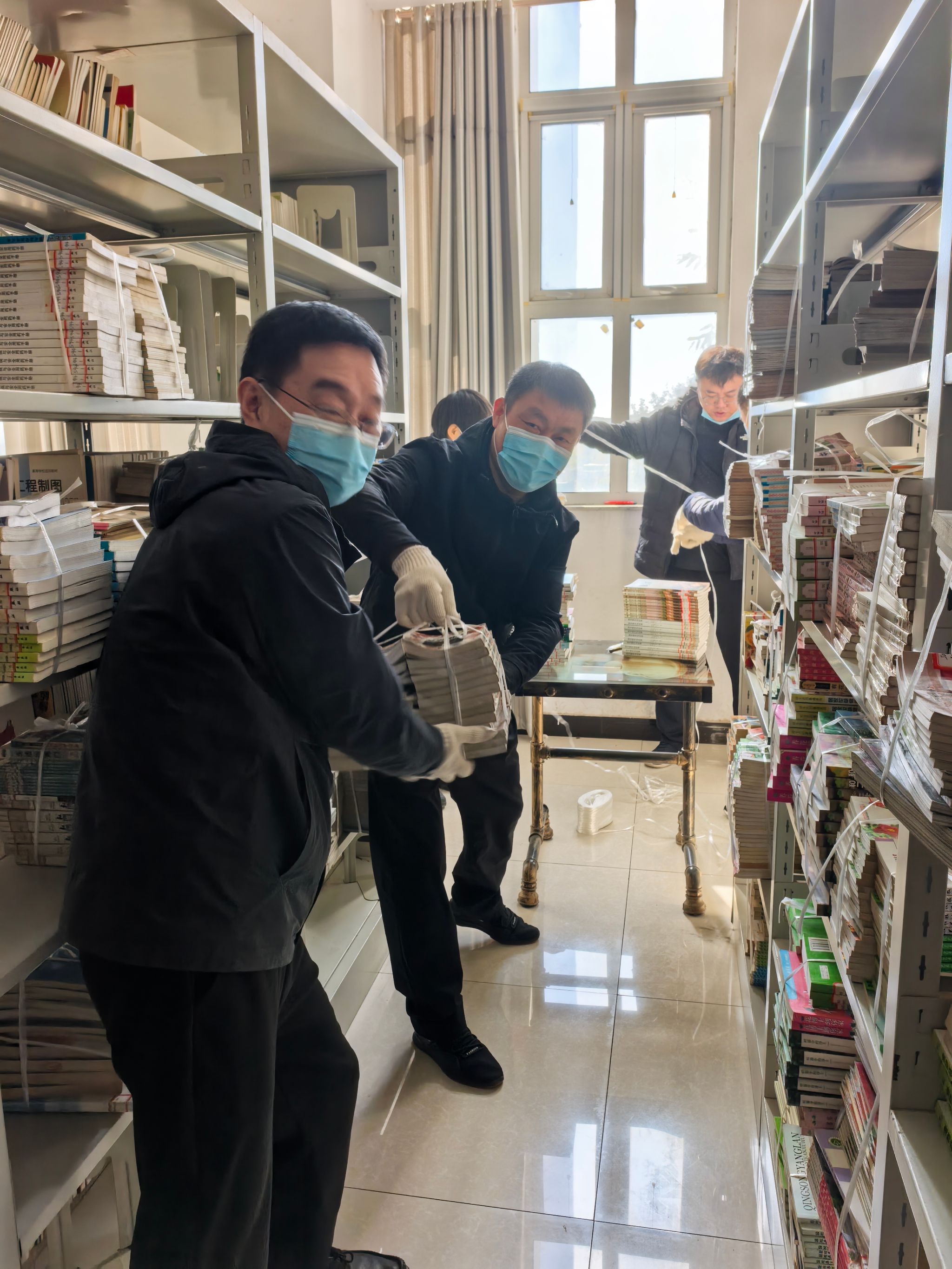 搬迁现场,全体参与人员分工协作、默契配合:有的负责按图书学科分类整理,确保每本图书归属清晰;有的手持打包绳,仔细将图书码放整齐;有的则逐一核对图书编号与数量,同步做好登记记录,避免疏漏。大家克服图书数量多、种类杂的挑战,始终保持严谨细致的态度,经过四天的奋战,圆满完成近10万册图书的打包与搬运任务。