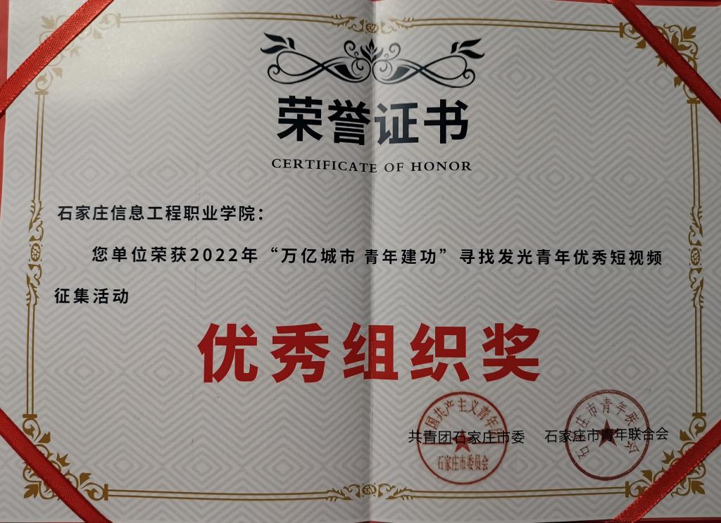 世界杯官网师生在2022年“万亿城市 青年建功”寻找发光青年优秀短视频活动中荣获二等奖一项,三等奖八项,学院荣获优秀组织奖。