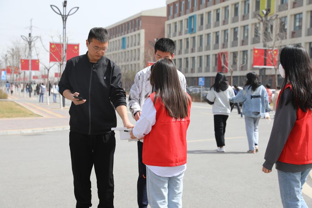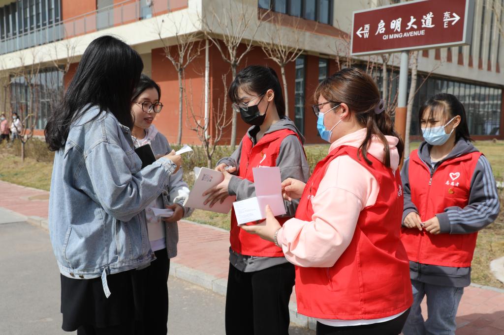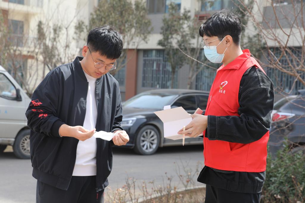 学生志愿者对在校的学生免费发放口罩并提醒疫情防控的重要性,务必公共场所佩戴口罩。